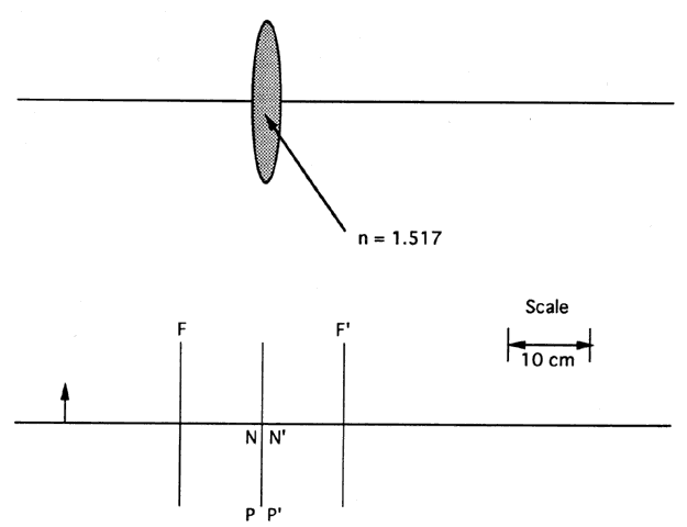 RAY SKETCH Although physically the lens has two surfaces, optically the lens is thin so it can be represented by a single surface. As in the case of a single refracting surface, the principal planes coincide. The difference between this and the previous examples is that the nodal points coincide with the principal points. The ray sketch is shown in Figures 93 and 94.