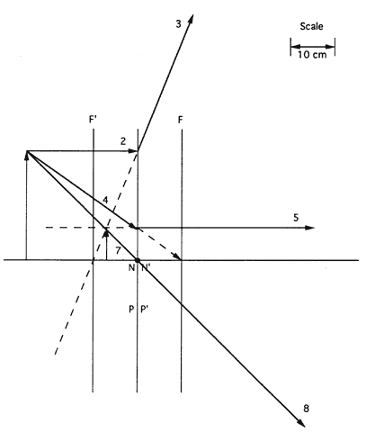 The primary focal point is nair/+ 10.00 D = 10.00 cm in front of the vertex. The secondary focal point is nglass/+ 10.00 D = 15.23 cm behind the vertex. The cardinal points are shown in Figure 88. Steps 2 through 8: These are illustrated in Figure 89.