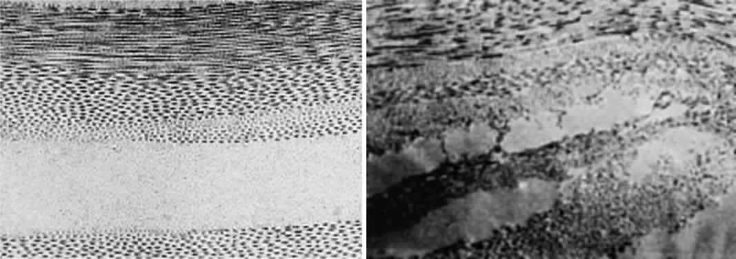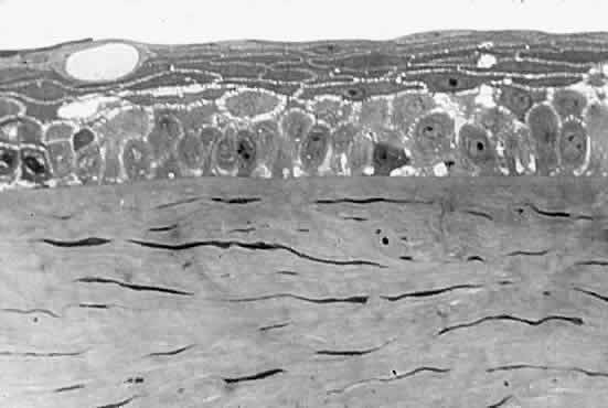 to the observer's eyes. The physical dimensions of light and matter can also explain light scattering. If light strikes a structure larger than 1000 nm, the light is absorbed. If the structure is less than 1 nm, the light passes by unaffected. However, if the object has a size between 1 and 1000 nm, light will be absorbed and re-emitted as a ray of similar wavelength, but in a different direction. This phenomenon of light scattering takes place among the water particles of a cloud and is responsible for the clouds' opaque appearance. (In a subsequent section of this chapter, the principles of light scattering will help unravel the behavior of the edematous cornea and the cataract.) |