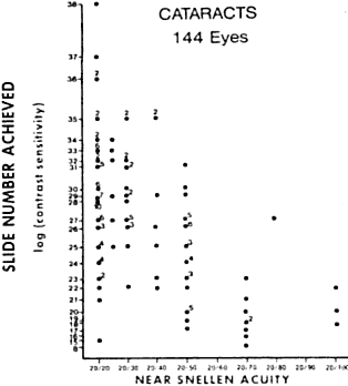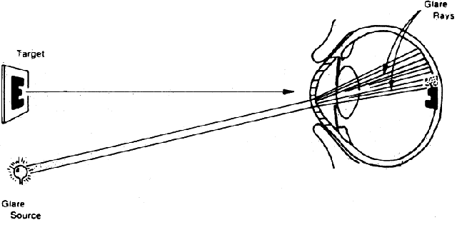 We see that this simple maneuver cuts the contrast in half. Just as the Snellen chart drops its contrast when extra light falls upon it, the retinal image loses contrast when a corneal lesion scatters extraneous light onto the macula (see Fig. 7). There are a number of simple ways to decrease glare and improve contrast: