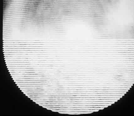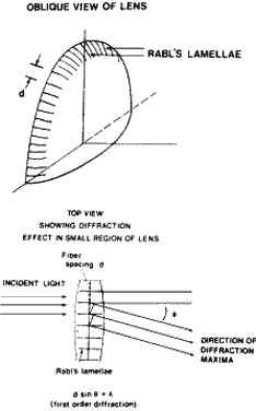 LASER INTERFEROMETRY When a patient develops a cataract and a concomitant decrease in vision, the ophthalmologist must decide whether the visual loss is completely explained by the lens changes. The problem may be compounded by a history of degenerative retinal disease. If a way could be found to bypass the lens opacity, or any ocular opacity for that matter, and project a resolution target directly upon the macula, the question of the state of retinal function might be answered. It occurred to Green and colleagues19 at the University of Michigan that a proper resolution target could be a set of interference fringes of light and dark bands. The source of the interference fringes could be two tiny light sources, which could be focused directly onto two relatively clear areas in the opaque lens. These tiny sources could then direct their rays, without obstacle, toward the retina, and their light would interfere with each other to produce dark and light bands upon the retina. Thus, the Michigan group essentially duplicated Thomas Young's original experiment, with a few important changes. The two-point light source came from a safe, low-power HeNe laser. Laser light, being coherent and of one pure color, can come to a very fine point focus and produces vivid interference patterns. The light of the HeNe laser, being red, is also scattered less than other visible wavelengths and thus penetrates the opaque media more cleanly. Finally, Green was able to alter the widths of the dark and light bands by altering the spacing of the two light sources and thus present resolution levels comparable to the scale of the Snellen letters.20,21 Figure 12 contrasts the patterns seen by patients with normal vision and patients with cataracts. The potential acuity meter is another device for testing retinal visual acuity. It projects a small Snellen chart through a small, clear space within an irregular cornea or partially cloudy lens onto the retina. This approach minimizes the influence of the anterior segment problem. It is used to predict postoperative visual function.22 HALOES Every medical student is taught that patients with angle-closure glaucoma report seeing colored haloes. Interestingly, similar haloes are more commonly associated with the presence of early cataracts or epithelial corneal edema from poorly fitted contact lenses. In this section, we present the optical derivation of these haloes.7 Lens Haloes Figure 13 is a histologic frontal section of a lens wedge showing cross-sections of lens fibers, stacked like pancakes. This radiating pattern is known as Rabl's lamellae, the fibers being more uniform beneath the epithelium and becoming thicker and irregular as they age and approach the nucleus. At the boundaries between the fibers, the refractive index is different from that in the fibers. Thus, the quasiregular fluctuation in refractive index acts as a radial diffraction grating and produces a circular interference pattern, or halo. The intensity of the halo increases as the separation between fibers widens. This occurs during cataract formation, when fluid accumulates between the fibers. It should also be pointed out that the lens fiber pattern is only regular enough to produce these effects from 2.5 mm from the lens center to the lens periphery. The optics are explained in Figure 14. Thus d in the equation d sinθ = λ represents the width of the lens fibers. Halo experiments predict the lens fiber diameter to be 10.5 μm, which agrees nicely with histologic measurements. As in all diffraction effects, the longer (red) wavelengths are diffracted more and appear at the edge, whereas the blue wavelengths are closer to the center of the halo. Finally, it should be noted that the location of the radial scattering elements on the lens periphery also serves as a basis for distinguishing lenticular haloes from those of corneal origin. Ask the patient to view with a stenopeic slit the point source of light producing the halo. As the slit is moved downward, the patient will see only fragments of the halo if it originates in the lens. If the halo is corneal in origin, the whole halo will still be seen, but dimmer with the slit than without. Corneal Haloes The ancient sailor knew that a ring around the moon meant foul weather the next day. Rings, or haloes, around the moon are created by ice crystals in the atmosphere, which act as a cosmic diffraction grating. In a similar way, edematous corneal epithelium produces haloes. Let us refer back to Figure 6, which represents corneal epithelial edema, the type seen in, for example, acute glaucoma, advanced endothelial dystrophy, and contact lens overwear. When edematous, the basal epithelial layer acts as a diffraction grating and appears to be the origin of the halo. In physical terms, we have a meshwork of edema fluid of one refractive index surrounding basal cells of another refractive index. If this fluctuation in refractive index has a regular pattern and covers 10 or more cells, it will serve as a diffraction grating. A series of colored rings representing the colors of the spectrum is called one order of interference rings. A second series of colored rings outside of the first is called a second order of rings. The larger the edema pools between epithelial cells are, the brighter is the second order. The halo itself often consists of two orders of colored rings, the outer order being somewhat fainter. PINHOLE DISCS Diffraction is an edge phenomenon, in which the relative impact of the diffraction is proportional to the ratio of the circumference of the edge to the area of the aperture: πD/(πD2/4) = D/4 Therefore, as the pupil of the eye or the camera gets smaller, the ratio 4/D gets greater. This effect was brought out clearly in a series of experiments in which we attempted to correct various degrees of refractive error with different-sized pinholes.23 The pinhole improves vision by increasing the depth of focus; however, it obscures vision by int