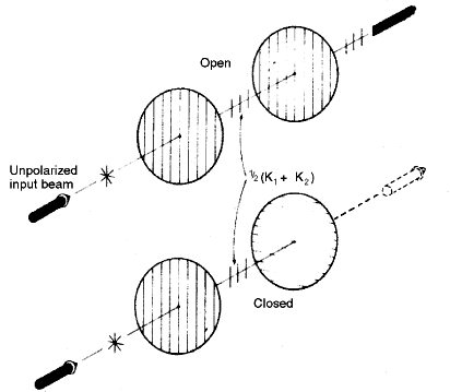 and equal side-to-side components. Such light is considered unpolarized. To remove one component, it should be possible to locate a transparent material whose molecular anatomy resembles a picket fence. In such a case, the up-and-down component of the wave might squeeze through, but the side-to-side vibrations would collide with the pickets and be redirected, producing two separate light rays. Such a material (crystals of calcium carbonate known as Iceland spar) was discovered in 1669 by the Dutch physician Erasmus Bartholinus.4 We now know that as light penetrates the crystal, vibrations parallel to the planar carbonate groups are slowed down, as if bumping into these molecular “pickets,” to a greater degree than the vibrations perpendicular to these groups. The result is an ambivalent crystal that refracts light waves vibrating in one direction differently than it refracts those vibrating in a perpendicular direction. In 1828, the British physicist William Nicol glued two pieces of Iceland spar together in such a way that light waves vibrating in one direction passed through the crystal; the other waves were refracted differently and so struck the crystal-glue interface and were reflected out of the way. Thus, light emerging from a Nicol prism would be considered plane polarized, representing about half the original light intensity. If this light then passed through a second Nicol prism, aligned in a similar fashion, the light would pass through unchanged. However, if the second Nicol prism, called an analyzer, were rotated by a small angle, the molecular pickets would eliminate some of the plane-polarized light. Finally, if the second Nicol prism were rotated in an orientation 90° from the first, no light would get through (Fig. 16). In 1932, Edwin Land made available an inexpensive substitute for the Nicol prism, which he called polaroid. Polaroid is made of an extremely thin layer of many fine crystals of iodine and quinine sulfate. This compound, known as herapathite, after its discoverer W.B. Herapath, is unique in that it strongly absorbs one of its double-refracted beams so that light vibrating in only one direction gets through. Land succeeded in lining up all the crystals in one direction and imbedding them in plastic sheets, which could be manufactured on a commercial basis. As a sunglasses material, polaroid not only attenuates the light, but also eliminates reflected glare. When light is reflected from the surface of water, it is partially polarized (i.e., part of the reflected rays are plane polarized). If the axis of the polaroid sunglasses is oriented perpendicular to this direction, much of the reflected light will be absorbed. The polarization principles have been around for more than 100 years, with some ophthalmic applications. The three-dimensional (or stereoscopic) vision seems to be related to the capacity of our brain to interpret slightly different images from both eyes. Nature uses the interocular distance itself as a source for the disparity by providing two different observation angles for real objects. An artificial way to recreate this angular disparity is through the use of polaroid glasses and polarized printed images. The light from each picture vibrates in a different direction, and each polarizing lens allows only one direction of vibration to be transmitted to each eye. Therefore two slightly different images are received by the brain and interpreted as a stereoscopic object. This is the principle of the Titmus test to access stereopsis, mainly in children with strabismus. The polarization phenomenon can also be used to create a disappearing reticule to be placed in the surgical microscope eyepiece. Let us assume that a surgeon would like to measure an ocular structure during an operation (i.e., pupil diameter), or the size of a corneal reflection (which can be converted into a measure of corneal power). A measuring reticule, in one of the eyepieces of the microscope, would be needed; however, the presence of the ruled reticule during the surgery might annoy the surgeon. How can the reticule be made to disappear and then reappear? Let the marks of the measuring reticule be made of a polarizing material. Let the reticule also be rotatable. Now place a polarizing filter over the microscope light. If the light reflected from the eye is polarized with the same orientation as the markings of the reticule, then the markings will be invisible. If the reticule is rotated 90° then it will be easily seen. HAIDINGER BRUSHES We humans also possess a polarization sensor in our eyes, although it is very primitive. The first description of this polarization effect was made by the German mineralogist Wilhelm Karl von Haidinger, in 1844. Haidinger brushes are entoptic phenomena seen best when a uniformly blue background (e.g., the sky) is visualized through a polarizing element. The brushes look like two yellow sheaths of wheat extending out 2° to 3° from the point of fixation and separated by bright blue quadrants. Understanding the source of the brushes has challenged some of the greatest minds in science and ophthalmology over the years (e.g., Helmholtz, Brewster, Stokes, Gullstrand). The best explanation, so far, was presented by Ulf Hallden25 of Uppsala, Sweden, who was able to model the phenomenon with pieces of polaroid and cellophane. He believed that the initially polarized light travels through the nerve fiber layer of Henle in the macula, which functions as a yellow filter. The yellow filter effect is accomplished by the nerve fibers, which are double refracting (birefringent) and of a thickness that allows constructive interference for the two sets of waves of yellow and blue. Finally, the radial polarizer (analyzer) located in the photoreceptors absorbs the light wherever the radial elements are perpendicular to the vibration of the polarized light. Yellow light comes through, and light in adjacent quadrants is diminished. The Haidinger brush phen