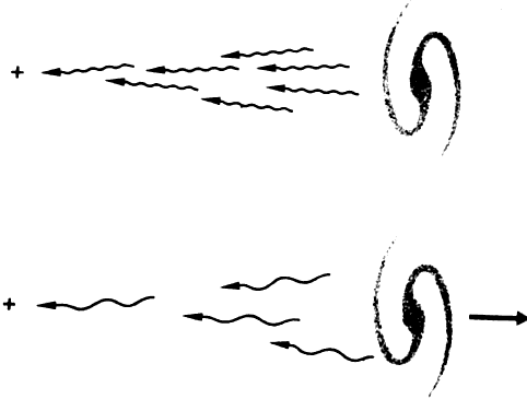 the train speeds away, its distance from us gets longer (Fig. 22). Thus, although the whistle blows at 10 cycles/second, by the time we
