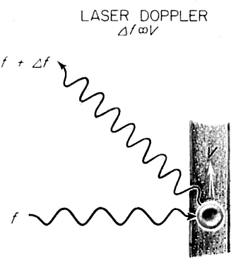 In 1929, the American astronomer Edwin Hubble noted that the galaxies were rushing apart and that the universe was expanding. Hubble had actually looked at the galactic spectra and noted that the light was shifting to the red. Using the Doppler effect, he calculated the speed of recession of the galaxies. This same principle can be used to measure the velocity of blood in the retinal circulation in a noninvasive way (Fig. 23). The laser Doppler velocimeter directs monochromatic light to a retinal blood vessel. The moving blood cells within the vessel backscatter the light. This light shows a shift in frequency that is proportional to the blood velocity. In the laser Doppler velocimeter, the backscattered light is made to interfere with the original light to best bring out the frequency shift.