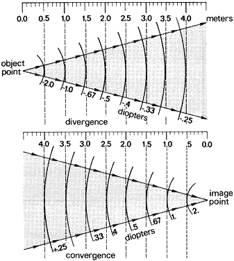 equals the reciprocal of the radial distance in meters: Vergence = 1/Distance in meters Light that is converging toward an image has positive vergence. The wavefronts become increasingly curved as they approach the image point, and the vergence increases correspondingly. For example, at a distance of 4 meters, the vergence is ¼ = + 0.25 D; at 2 meters, the vergence is ½ = + 0.5 D. Diopters of convergence (+) and divergence (-) for various distances from object and image are tabulated as shown in Table 1.