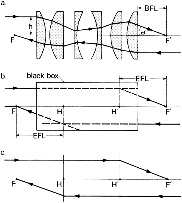 focal point F', the series of lenses is replaced by a black box (see Fig. 11b). What is in the black box is unimportant once the height of incidence