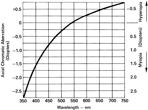 is called the near-point of accommodation. The sequential occlusion of the two holes of the Scheiner disc can be used to find the refractive state of the eye. For example, the pencil of rays through the lower hole will strike the hyperopic retina below the axis and the myopic retina above the axis. The hyperope will note a disappearance of the upper image (opposite), and the myope will not see the lower image (same) when the lower hole is occluded. (Hint: project the retinal point back through the nodal point for the apparent direction of the same source.) Thomas Young (1773-1829) pioneered the investigation of the accommodative mechanism of the eye. Theoretically, the eye may change its focus in several ways. It may change its axial length. This is essentially how a camera is focused for near objects. The lens simply is moved farther from the film plane by means of a focusing ring built into the lens barrel or, in extreme close-up work, the lens is attached to a bellows that permits positioning the lens through a much greater range. A natural question, then, is whether the eye elongates to focus on near objects. A young emmetrope can focus easily on an object 10 cm from the eye. We can find the elongation of the eye required to place the retina in the image plane of this object with the vergence equation. The eye must elongate to 27.7 mm. When the object is at infinity, the position of the image was shown to be 22.9 mm, thus, the growth in axial length of the eyeball is 27.7 - 22.9 = 4.8 mm. This is a change in axial length of more than 20% of the emmetropic length of the eye, and it must be accomplished almost instantly, imperceptibly, and unflaggingly during the waking hours. Clearly, the human eye does not accommodate in this manner. Accommodation also may be mediated through an increase in the power of its refractive elements. The eye theoretically may increase its power through a shortening of the radius of curvature of the cornea or the lens or by an axial shift of the lens. Young did an experiment in which he immersed his eyes in water. By nearly matching the refractive indices at the water/cornea interface, he practically eliminated the corneal refractive power. He became an extreme refractive hyperope. To see distant objects clearly, Young introduced a positive lens to replace the lost corneal power and could accommodate for near objects. Thus, he showed that accommodation could be exerted despite the neutralization of the cornea. Although the crystalline lens remained the most logical agent of accommodation, the question to be resolved was whether the crystalline lens moved axially or changed shape. Axial movement was eliminated by the constraints on how much the lens could move within the anterior chamber. Calculations show that the depth of the anterior chamber is not sufficient for maintaining the focus of near objects. The steepening curvatures of the crystalline lens account for the ability to accommodate. Helmholtz concluded that the zonule maintains shallow lens curvatures in the unaccommodated state. Relaxation of the fibers, when the ciliary body constricts, allows the elastic capsule of the lens to assume a rounder form. Tscherning noted that the central portion of the lens became more deeply curved whereas the peripheral zone of the lens surface flattened during accommodation. He concluded that this occurred because of an increase in tension by the zonule during accommodation. It generally is accepted that Helmholtz is correct in concluding that relaxation of tension by the zonule allows the lens to assume a more deeply curved form. Fincham concluded that it was the nonuniform thickness of the lens capsule that caused the bulge in lens curvatures in accommodation rather than capsule elasticity.23 Gullstrand provides a radius of curvature of 10 mm for the anterior surface of the crystalline lens when relaxed and a radius of curvature of 5.33 mm when accommodated by nearly 10 D. The axial thickness of the lens slightly increases because of the forward bulge of the anterior surface. Mainly because of the bulge, the power of the lens increases from 19 to 33 D, and the power of the eye correspondingly increases from 58.64 to 70.57 D. STIMULUS FOR ACCOMMODATION The nature of the optical stimulus for reflex changes in accommodation has been debated for more than 50 years. The standard view is that accommodation is a closed-loop negative feedback system that alters focus to maximize or optimize the luminance contrast of the retinal image. In this view, contrast is reduced both for underaccommodation and overaccommodation, and feedback from changes in defocus blur is an essential part of the accommodative process. However, recent experiments confirm that accommodation responds in the absence of blur feedback13 and that the stimulus on the retina has directional quality that distinguishes myopic from hyperopic focus. Along these lines, Fincham29 suggested that accommodation responds directly to the vergence of light at the retina, using the effects of chromatic aberration and the Stiles-Crawford effect. At spatial frequencies above approximately 1 cpd, chromatic aberration ensures that the contrasts of long-, middle- and short-wavelength components of the retinal image are different. For example, the relative contrasts red>green>blue specify focus in front of the retina. In one model of the process, the refractive state of the eye is determined by comparing relative cone contrasts, measured separately by L-, M- and S-cone classes. In addition to the effects of chromatic aberration, the waveguide nature of directionally sensitive foveal cones could play a role in the accommodative process, but the notion remains largely unexplored. AMPLITUDE AND RANGE OF ACCOMMODATION When the eye is accommodated fully, the point in space conjugate to the retina is the near-point of the eye. It is the nearest point of distinct vision. How much accommodation is exerted from the relaxed state to