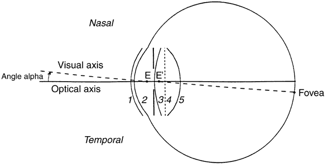 retina. Unlike the components of most optical systems, typified in Figure 2, the cornea and lens are not centered on a common axis, nor are they spherically