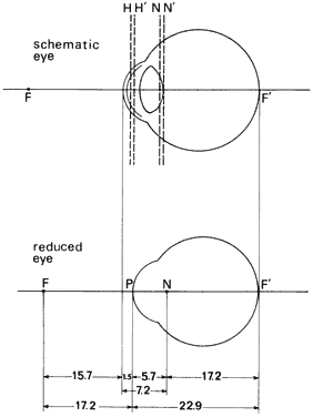 nodal points are called points of unit angular magnification. When both the object and image lie in a medium of the same index of refraction, the first and second nodal points coincide with the first and second principal points (Fig. 12c), a lens system surrounded by air. If the lens is a simple thin lens in a uniform medium, the principal and nodal points all coincide at the vertex of the lens (see Fig. 12a). If the image is not in the same medium as the object, as in the single refracting surface of Figure 12b, however, the nodal points do not coincide with the principal points. The two principal points coincide at the vertex of the surface, and the two nodal points coincide at the center of curvature of the surface. For all these cases, the slope of the ray directed toward the first nodal point is the same as the slope of the ray that appears to emerge from the second nodal point. The eye is a complex series of refracting surfaces that forms an image in vitreous of an object in air. Therefore, it has a pair of principal planes and a separate pair of nodal points that can be used to represent it. Their positions are shown in Gullstrand's schematic eye (Fig. 13). |