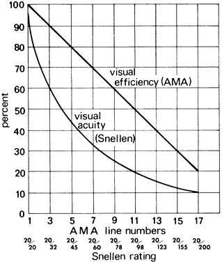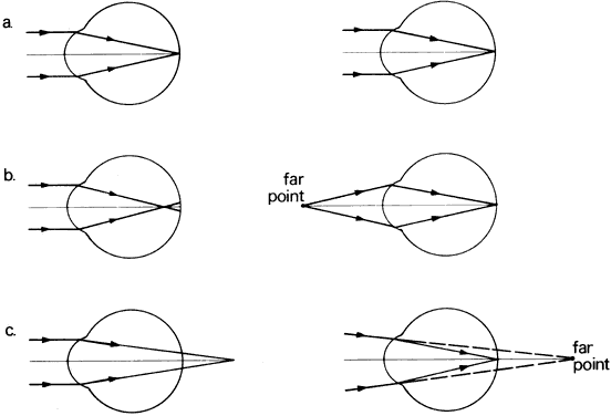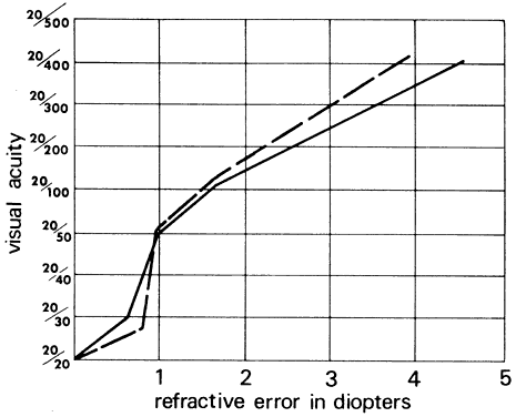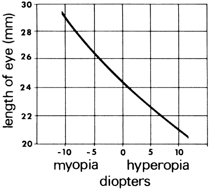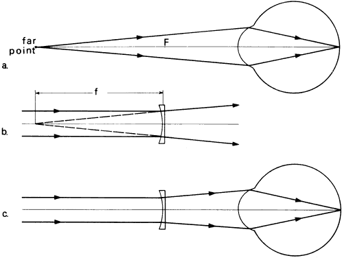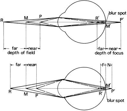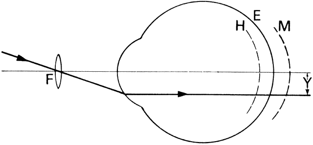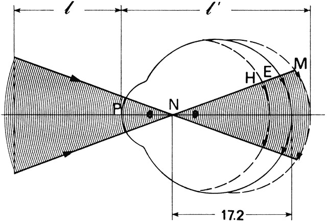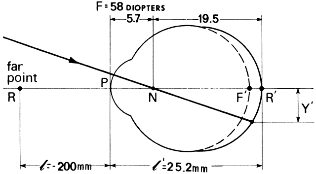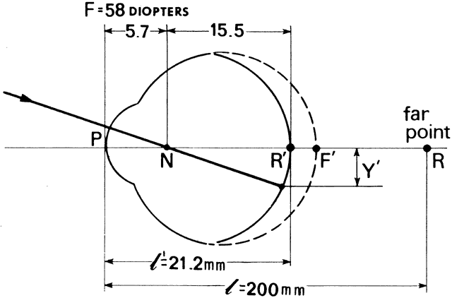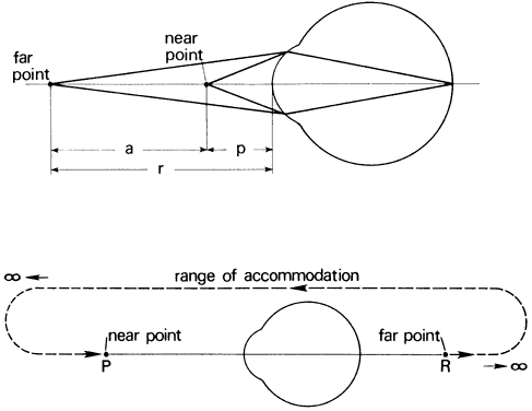 The emmetrope's far-point r is at infinity, therefore, R = 1/∞ = 0. Substitution into the equation R - P = A, results in 10 = 0 - P, or the dioptric value of the near-point is P = -10 D. This corresponds to a near-point distance p = 1/P, or p = -1/10 meter = -10 cm. The emmetrope's range of accommodation is from 10 cm in front of the first principal plane of the eye to infinity. The hyperope has a far-point R = + 5 D, that is, the far-point distance r is 1/5 meter behind the eye. P = R - A = 5 - 10 = -5 D. The near-point distance p is one fifth of a meter in front of the eye. In effect, 5 D of accommodation were exerted to overcome the hyperopia, to see sharply at infinity, and the remaining 5 D determined the near-point. The range of accommodation of the hyperope is from 20 cm in front of the eye, through infinity, to 20 cm behind the eyes (see Fig. 81). The dioptric value of the far-point of the 5-D myope is R = -5. Thus, P = -5 - 10 = -15 D. The range of accommodation of the myope is a = p - r = -100/15 + 100/5 = -6.7 + 20 = + 13.3 cm, or from 6.7 cm to 20 cm in front of the eyes. These examples illustrate the limited range of accommodation available to the myope who otherwise has an amplitude of accommodation equal to that of an emmetrope and hyperope. |