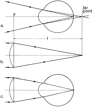 Briefly, the corneal portion, including the tear layer, separates air from aqueous humor, and the lens portion separates aqueous from vitreous humor. Rays entering the eye are refracted first and by the greatest amount at the first surface of the cornea because of the large difference in index of refraction at the air-to-cornea interface. The second surface of the cornea has negative power; nevertheless, the cornea contributes over 70% of the approximately 64 diopters (D) of refractive power of the unaccommodated eye. The crystalline lens supplies the remaining refractive power. During accommodation, additional power is supplied by the lens, which assumes a rounder form. |