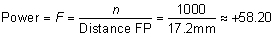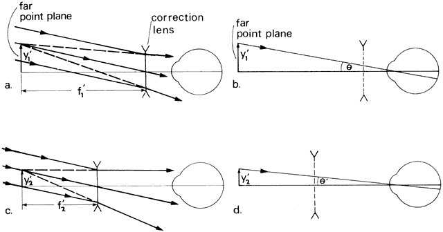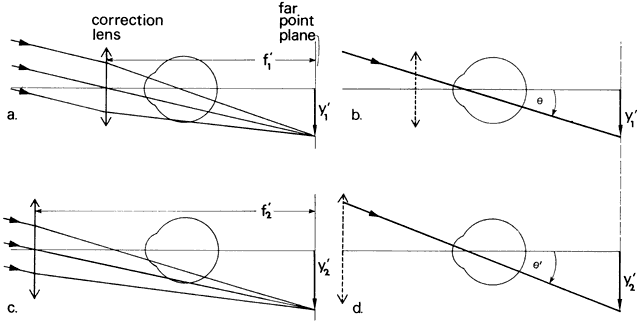 where: F1 is the refracting power of the first element, F2 is the power of the second element, and c = d/n is the reduced distance separating the two elements. This equation will prove useful when the combined power of the eye and a spectacle lens is considered. The dioptric power of the spectacle lens will be F1 and the dioptric power of the eye will be F2. The distance from the eye at which the spectacle lens is fitted is d; n = 1 because the medium between the lens and the eye is air. Applications of this equation are shown in Figures 67 and 69. |