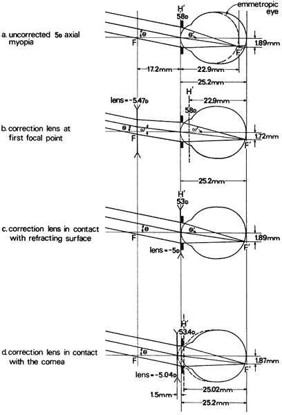 Usually, the closer a lens is fitted to the refractive ametrope, the less magnification there will be. The magnification effects for a correction lens at the first focal point of the eye compared with a contact lens are summarized in Table 7. RELATIVE SPECTACLE MAGNIFICATION AND ANISEIKONIA Aniseikonia is produced by RSM in anisometropia. For example, let the myopic conditions of Table 7 apply to the right eye and let the left eye be emmetropic. The left eye retinal image size of a 0.1-radian target will be 1.72 mm. Axial myopia corrected at the first focal point results in a 1.72-mm image. Refractive myopia that is corrected with a lens in contact with the reduced eye also results in a 1.72-mm image. These right eye corrections produce no aniseikonia or RSM. However, the axial myopia correction at the eye produces a 1.89-mm image. This results in + 9.9% aniseikonia and RSM. Similarly, the refractive myopia correction at the first focal plane produces a 1.59-mm image or -7.6% aniseikonia and RSM. |