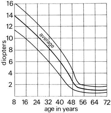 clearly from 4 meters out to infinity. The relationship between amplitude of accommodation and age was investigated by Donders and for a long time was used as a basis for prescribing a near add. Measurements of monocular amplitude of accommodation were made on 4000 eyes by Duane. The results, shown as an average middle curve and upper and lower ranges on amplitude at any given age, are plotted in Figure 82 and listed in Table 8.