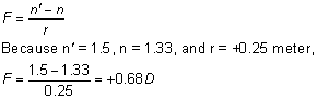 The reduced vergence of the refracted light is L' = L + F = -0.44 + 0.68 = + 0.24 D. By rearranging the equation L' = n'/l' to give l' = n'/L' = 1.5/0.24 = 6.25 meters, we obtain the position of the image. It is real and located 6.25 meters in glass to the right of the refracting surface. |