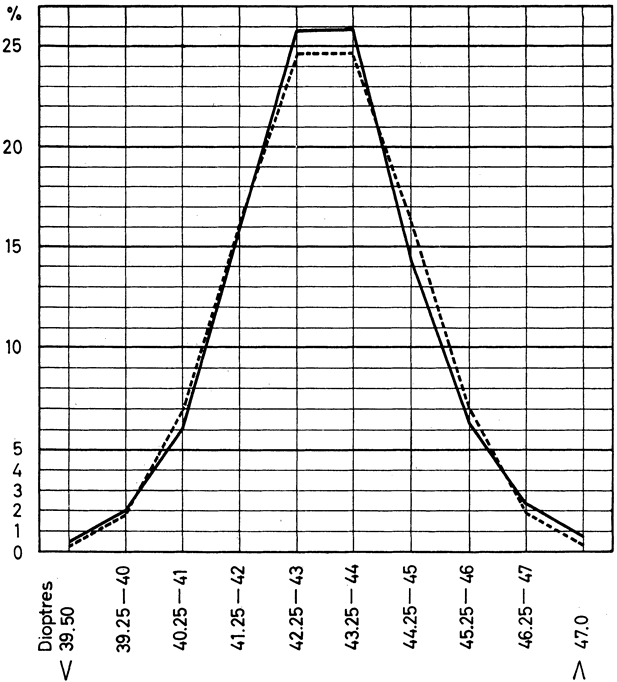having been given to the latter question.5 Steiger6 broke with the older views on the nature of emmetropia and refractive error. No longer regarding average values as constants, he postulated instead a wide range of refractive errors on the basis of distribution actually observed in the corneas of 5000 eyes, that is, a distribution conforming to a normal (or binomial) curve (Fig. 1). His measurements, which showed corneal values extending from 39 to 48 diopters (D) and a lack of any fixed corneal value for emmetropia, enabled Steiger to calculate the axial length in emmetropia as theoretically extending from 21.5 to 25.5 mm.