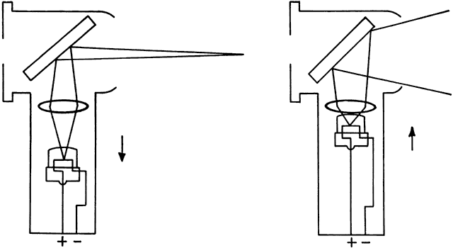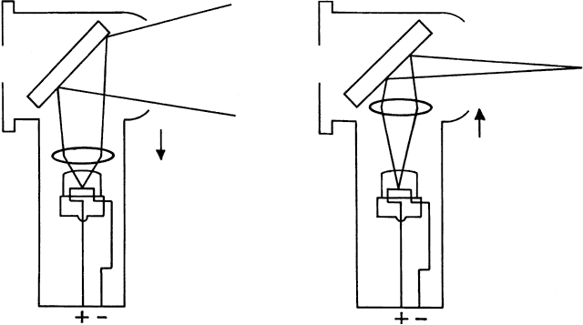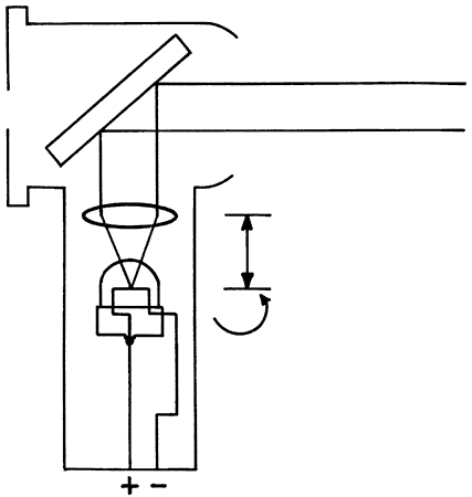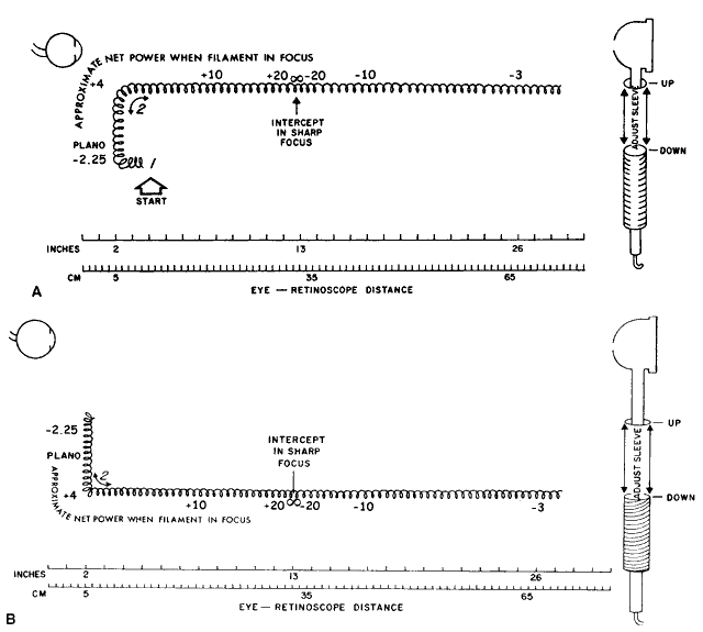 refractive state. Explaining the optics and proper usage of the retinoscope can be a confusing business. To help simplify the text, we have chosen to use the feminine pronouns (e.g., “she” and “her”) when referring to the retinoscopist, and the masculine ones (e.g., “he,” “him,” and “his”) when referring to the patient. All streak retinoscopes are made of the same fundamental components: light source, condensing lens, mirror, and sleeve (Fig. 1). The light source is a light bulb with a fine, linear filament, which projects a fine, linear streak of light with the passage of an electric current. The filament (which should be considered a linear point source of light), and therefore the streak, can be rotated 360 degrees by rotating the sleeve of the retinoscope. Currently, most retinoscopes use a halogen bulb, which projects a very bright streak. The condensing lens is a plus lens, which exerts positive vergence on the streak, which is emitted from the point-source filament in a highly diverging manner. The position of the lens in relation to the light filament can be altered by raising or lowering the sleeve. In this way, the vergence of the streak that is emitted from the retinoscope can be controlled by the retinoscopist, as described subsequently. The mirror bends light that originates in the handle and is initially projected upward toward the ceiling, to instead exit the retinoscope along an axis parallel to the floor so that it can be projected into the patient's eye. The mirror should not reflect 100% of visible light; rather, it must allow some light to pass through it. Only in this way can the retinoscopist have a view into the patient's pupil that is coaxial to the path of the streak. OPTICS OF THE PEEPHOLE The true peephole of the retinoscope is not the hole on the examiner's side of the instrument; rather, it is a “hole” in the reflecting mirror. The peephole may be manufactured in two basic ways. One is to leave a round area of the mirror unsilvered, whereas the other is to partially silver the mirror so that it acts as a beam splitter. The size of the hole is also a consideration in the design of the instrument. A large hole decreases the useful light reflected into the subject's eye. At the expense of internal reflections, the beam-splitter helps provide light needed by the retinoscopist to find the subject's pupil and to maintain a coaxial position. To decrease glare and polarization, some retinoscopes introduce filters between the true peephole and the back of the retinoscope peephole. The peephole allows the retinoscopist's view into the patient's eye to be coaxial to light emitted from the retinoscope. If this coaxial relationship between the path of the retinoscopist's line of sight and the emitted streak is not established, or she will not see a red-reflex image of the streak. Instead, only the patient's black pupil will be seen, and the retinoscopist cannot obtain any information regarding the patient's refractive status. Tilting the retinoscope allows some areas of the retinal reflex to be seen through the peephole while other portions are cut off and are perceived as a dark shadow in the subject's pupil. CONTROLLING THE PROPERTIES OF THE RETINOSCOPE The basic idea behind the retinoscope is that the retinoscopist creates a streak of light, projects it into a patient's eye, bounces it off his retina, and makes deductions concerning the patient's refractive status based on what the image of that streak looks like when it reaches the retinoscopist's eye. To aid her in this task, the retinoscopist has control over, and can easily vary, certain aspects of the system. Two things she can control have nothing to do with the intrinsic properties of the retinoscope she is holding—the distance between the retinoscopist's eye and the patient's, and which lenses she may be holding between the patient's eye and her own; thus, these are not discussed in this section. However, two properties over which the retinoscopist has total control are completely intrinsic to the retinoscope she is holding. The first is the orientation of the streak as it leaves the retinoscope. Because the light source for the retinoscope is a fine filament, the light emanates from the retinoscope as a fine streak. By rotating the light source, the retinoscopist can easily alter the orientation of the streak by more than 360 degrees. Merely by rotating the sleeve on the handle of the retinoscope, she can project a streak whose orientation is parallel to the floor, or perpendicular to it, or any meridian in between. This feature of the retinoscope proves invaluable when examining patients with astigmatism. The second property that can be controlled easily by the retinoscopist is the vergence of the incident streak. With the touch of a finger (or thumb), the retinoscopist can alter the streak so that it leaves the retinoscope as converging, diverging, or even parallel light. This feature gives the retinoscopist an incredible amount of power in evaluating a patient's refractive state. Unfortunately, it is probably the most underused feature of the retinoscope. The average retinoscopist uses only diverging light (plane mirror) when performing an objective refraction, and therefore limits what she can truly accomplish with the apparatus. Changing the distance between the light filament and the condensing lens alters the vergence of the emitted streak. This can be accomplished by raising or lowering the sleeve in the handle of the retinoscope. This is the most fundamental way in which different models of retinoscope will contrast, and it is obviously important for the retinoscopist to be familiar with the type of retinoscope with which she is working. In the earliest models of retinoscopes (e.g., Bausch and Lomb Copeland [1928] and Copeland-Optec 360 [1958]), the condensing lens is fixed, and the light source can be raised or lowered by moving the sleeve up or down (Fig. 2). When the sleev