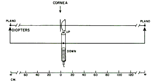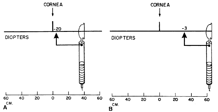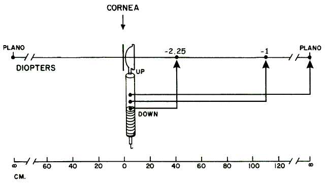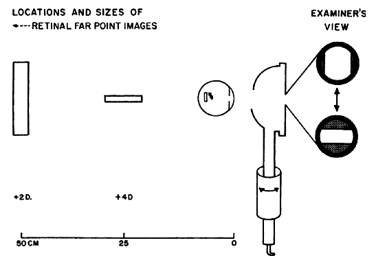 The reader must understand four specific differences between the performance of ophthalmoscopic retinoscopy and neutralization retinoscopy. First, during ophthalmoscopic retinoscopy, the working distance starts at 5 cm from the patient and ends at 66 cm, whereas the working distance remains at 66 cm for neutralization retinoscopy (Fig. 6). Second, the sleeve is “spiraled” up during ophthalmoscopic retinoscopy—it is rotated while it is raised from the sleeve down to the sleeve up position, whereas for neutralization retinoscopy, it is left in the sleeve down position and swept from side to side across the pupil. Third, no lenses are used during initial ophthalmoscopic retinoscopy, but they are almost always used during neutralization retinoscopy. Fourth, the end point for ophthalmoscopic retinoscopy is a clear, sharp “ophthalmoscopic” image of the retinoscope streak, whereas for neutralization retinoscopy the end point is the neutralization reflex where the pupil immediately fills with an unfocused image of the streak. The basic idea behind ophthalmoscopic retinoscopy is that the retinoscopist can determine when the focal point of the retinoscope falls on the focal point of the patient's eye. When this occurs, the retinoscopist can see the image of the retinoscope streak as a sharply focused line in the patient's pupil. By altering both the distance of the retinoscope to the patient's eye and position of the focal point of the emitted streak from the retinoscope head (which is another way of saying the “vergence” of the emitted streak), the retinoscopist can superimpose the focal point of the retinoscope onto the focal point of the patient. OPHTHALMOSCOPIC RETINOSCOPY OF SPHERICAL EYES When performing ophthalmoscopic retinoscopy, the retinoscopist begins with the retinoscope 5 cm (about 2 inches) away from the patient's eye with the sleeve all the way down (Fig. 7). The streak exits the retinoscope head as diverging light that comes to focus at a distance 40 cm behind it (behind the retinoscopist's head) in virtual space. If the patient is a -2.25 D myope, the focal point of the retinoscope lies in the same point in space as the focal point of the patient, and the retinoscopist sees a finely focused streak of light in the patient's pupil. It does not matter that the focal point of the retinoscope is in virtual space; it only matters that the focal point of the retinoscope is coincident with the focal point of the patient. At this point, the patient's and retinoscope's focal points are conjugate. The retinoscopist now rotates the streak 360 degrees by rotating the sleeve in the retinoscope handle. If the streak image is in focus in all meridians, the patient has no astigmatism, and ophthalmoscopic retinoscopy is complete at this stage. However, if the streak is in sharp focus in one orientation, but out of focus in another, the patient has astigmatism. Estimation of the refractive errors of astigmatic individuals is discussed toward the end of this section. For now, let us concentrate on eyes with spherical refractive errors. Emmetropia and Mild Ametropia If the patient's refractive error is anything other than -2.50 D, the image of the streak in his pupil as seen by the retinoscopist will be out of focus—the farther the patient is from -2.50 D, the more out of focus the image will be. At this point, the retinoscopist slowly raises the retinoscope sleeve while rotating the streak 360 degrees (a technique known as “spiraling”). She keeps the retinoscope head 5 cm from the patient's eye throughout this step. As the sleeve is raised the first one third of its range, the focal point of the retinoscope moves farther and farther from the back of the retinoscopist's head until it lies on the horizon when the sleeve is approaching one third of the way up. If the image of the streak is in focus at this point, the patient's focal point must lie at infinity, and he must therefore be emmetropic (Fig. 8). All patients with refractive errors between emmetropia and 2.25 D of myopia should be discovered up to this point with the sleeve between all the way down and one third of the way up, with the retinoscope positioned 5 cm from the patient. The retinoscopist can easily learn to calibrate the sleeve position for the vergence and refraction at the 5-cm distance and depend on proprioception and a memorized calibration scale for this information. The mechanics of most retinoscopes make it difficult to permanently display this information on the handle. Fortunately, it is possible to place a written calibration on the handle of the Heine ophthalmoscope so that the 5-cm ophthalmic retinoscopy can be read with precision (see Fig. 5). The text in the preceding section explains how to calibrate any retinoscope, and the exercise can help you understand the optics. If the retinoscopist gets much above the midsleeve position with the streak not yet coming into focus, she continues to spiral the sleeve up. She is now in the area where the image of the streak of patients with low hyperopic refractive errors will appear in focus. This occurs because the streak is emitted in a converging nature when the sleeve is raised above the one-third mark. The focal point of the streak is now located in space behind the patient's head. When the sleeve is just barely above one third of the way up, the focal point of the streak is far behind the patient's head, near the horizon, and will be conjugate with the patient's focal point only if he is a weak hyperope (Fig. 9). As the sleeve is raised farther, the focal point of the retinoscope moves closer to the back of the patient's head. When the sleeve is raised all the way up, the focal point of the retinoscope lies 33 cm in front of it—roughly 25 cm behind the patient's cornea. The focal point of the retinoscope will be conjugate with the focal point of the patient if he is a + 4 hyperope. All hyperopes with refractive errors lower than + 4 should be discovered