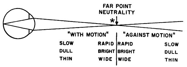 When the retinoscope is placed exactly on the patient's far point, neither “with” nor “against” motion is seen. At this point, all the light emitted from the patient's eye enters the retinoscopist's eye simultaneously. At exact neutrality, in a spherical eye with a small pupil, the retinoscopist may see no motion at all; rather, the patient's pupil seems to suddenly fill with light as the streak moves across it. This “on-off” phenomenon is important to recognize because it serves as the end point when performing the technique of neutralization. In addition to its direction of movement, other qualities of the reflected retinoscope streak can be evaluated. These qualities all give the retinoscopist clues as to how close to the far point the retinoscope is being held. The three most important qualities of the reflex are the speed at which it moves, its brightness, and its width. If one thinks of the reflex at the neutralization point as infinitely fast (so fast that it immediately fills the pupil without apparent motion), infinitely bright, and infinitely wide, it is easy to understand what the reflex should look like when the retinoscope is either near to, or far from, the neutralization point (Fig. 20). When the retinoscope is held near the patient's far point, the reflex should appear fairly fast, bright, and wide. As the retinoscope is moved farther from the far point, the reflex appears to move slower and is dimmer and thinner. The retinoscope can eventually be moved so far from the patient's far point that the reflex is slow, thin, and dim enough that it is quite difficult to recognize as a reflex at all. Optics of the Neutralization Reflex Five features characterize the neutralization end point, the point at which neither a “with” nor “against” reflex can be identified. Three of these are considered to define the end point, but two others can also be observed. The three standard characteristics are increases in speed, brightness, and width of the moving image. To these can be added , the “on-off phenomenon” (the intermittent disappearance of the observed reflex) and the scissors reflex.