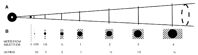 Estimating Low Myopes via Neutralization Without Lenses By now the reader should have determined that it is in fact quite possible to neutralize low myopes without the use of lenses. The trick is to place the retinoscope directly on the patient's far point, sweep the retinoscope streak across the patient's pupil with the sleeve down, recognize the “on-off” phenomenon of the neutralization reflex, measure the distance from the patient's eye to the retinoscope in meters, take the reciprocal—thus converting from meters (distance) to diopters (vergence)—and voilà, the patient's refractive error has been determined. For example, neutralization for a -2.00-D myope can be seen by placing the retinoscope 50 cm from the patient's eye, and for a -4.00-D myope by placing the retinoscope 25 cm from this patient's eye. Neutralization for an emmetrope can only be done in this fashion by placing the retinoscope infinitely far from the patient's eye—theoretically possible, but not practically feasible. Because the far points of hyperopes do not lie in real space (they lie beyond infinity), hyperopes cannot be neutralized in this way. The patients who are best served by this estimation technique of neutralization retinoscopy are those whose net refractive errors lie between -1.50 and -3.00 D, and conveniently this is exactly the group that lies outside the range of estimation possible with ophthalmoscopic retinoscopy. NEUTRALIZATION RETINOSCOPY OF SPHERICAL EYES The aforementioned technique describes a way to estimate a low myope's refractive error without the use of lenses. The key to this method is that the retinoscopist must change the distance that the retinoscope is held from the patient's eye when trying to find the far point. When performing neutralization retinoscopy, she does exactly the opposite—she holds the retinoscope at a constant specific working distance and uses lenses to bring the patient's far point to the retinoscope. The first thing that a retinoscopist must do is choose a comfortable working distance. She wants to be as far from her patient as possible while still being close enough to comfortably manipulate lenses in front of his eye. Thus, the working distance usually is described as “arms length” away from the patient. For the average retinoscopist, this distance works out to about 66 cm. Taller retinoscopists may prefer 75 cm, whereas shorter ones may use 50 cm. It is not uncommon for retinoscopists to work closer than their usual working distance in difficult cases, such as small children, or adults with cataracts or small pupils. The actual working distance does not matter as long the retinoscopist is aware of the distance and adjusts her calculations accordingly. The retinoscopist should be able to sit at her comfortable working distance while using lenses to bring the patient's far point to her. The retinoscopist accomplishes this feat by sweeping the retinoscope streak across the patient's pupil and evaluating the direction, speed, brightness, and width of the retinoscopy reflex. If she observes “against” motion, the retinoscope must lie beyond the patient's far point, and the retinoscopist can move the far point toward the retinoscope by placing a minus lens in front of her patient's eye. If the reflex is fast, bright, and wide, the retinoscope must have been near to the patient's far point, and a weak minus lens should be chosen. However, if the reflex is slow, dim, and narrow, the retinoscope probably lies a greater distance from the far point, and a stronger minus lens should be chosen. If “with” motion is observed after a minus lens is placed before the patient's eye, the patient's far point has been moved beyond the retinoscope because too strong of a minus lens was chosen. This lens should be removed and replaced with a weaker minus one. Similar manipulations are performed if “with” motion is initially seen when neutralization is begun. In such cases, the far point must lie beyond the retinoscopist's comfortable working distance. Again, how far away the far point lies can be estimated by judging the quality of the reflex. A plus lens then is chosen to bring the far point forward toward the retinoscope. Whenever possible, the retinoscopist should try to manipulate the far point in such a way that “with” motion is being observed. A “with” reflex typically is sharper and easier to judge than an “against” reflex. Thus, if “against” motion is seen, neutralization will be easier to perform if a strong enough minus lens is placed to push the far point beyond the retinoscope, so that the retinoscopist can observe “with” motion. Care must always be taken, however, when putting minus lenses in front of younger patients because they can easily “eat up” this minus by accommodating, thus leading the less careful retinoscopist down the wrong path. It should also be noted that the neutralization end point is not exactly an end point—rather it is an end zone that measures about half a diopter in depth (see Fig. 20). The true size of this “zone of doubt” varies with pupil size and working distance—it is narrowest with a small pupil and close working distance. Best results are achieved when entering the zone of doubt from the plus side, by watching the “with” motion reflex get faster, brighter, and wider until the retinoscopist is convinced the neutralization reflex has been achieved. If the zone of doubt is entered from the minus side (through “against” motion), there is a greater chance for error. Eventually, after just a few different lenses are placed before the patient's eye, the retinoscopist can observe the neutralization reflex. At this point the goal is achieved, and the retinoscopist has managed to bring the patient's far point to the retinoscope (which is being held at the working distance). The retinoscopist is now ready to write a spectacle correction. However, the lenses currently in front of the patien