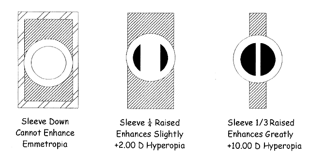 when evaluating astigmatism. At working distance, the pupil is completely or almost completely filled with light when an emmetropic or mildly hyperopic eye is examined with the retinoscope sleeve all the way down (Fig. 23). This was noted in the section on retinoscopic neutralization. The pupil is filled because the retinal image is magnified to a size at which it is actually larger than the pupil. Enhancement techniques involve altering the magnification of the retinoscopy reflex to make it appear as thin as possible. No discussion of these techniques can be undertaken unless the reader has a solid understanding of the optics of the magnification properties of the eye in the context of retinoscopy.