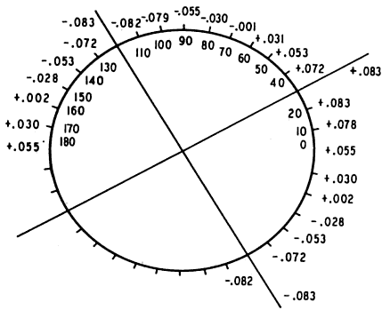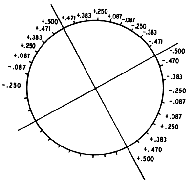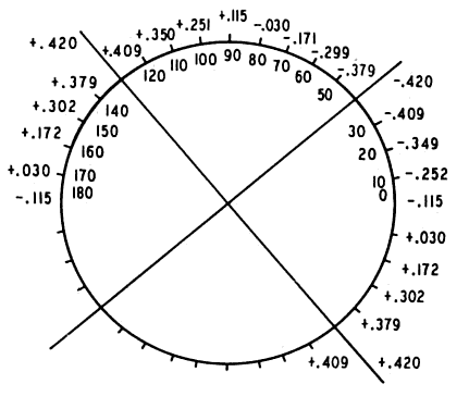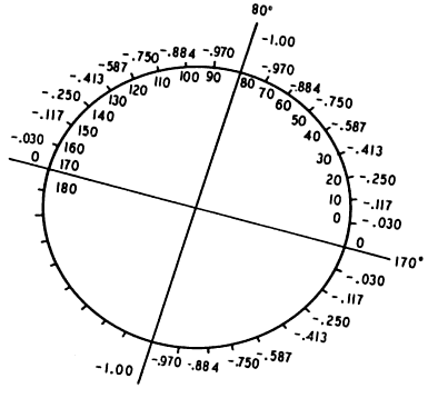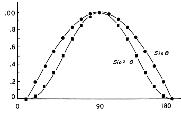 The sine of 0° is 0, the sine of 90° is 1, and the sine of 180° is once again 0. Between 0° and 90°, the values of sine increase from 0 to 1; they show a corresponding decrease between 90° and 180°. The sines of angles from 0° to 180° may be plotted on a graph, as shown in Figure 3 (the round points), and give rise to the sine curve. Many wavelike or cyclic phenomena may be described by a sine curve. In our current example, the changing powers of a cylindric lens seem to follow this curve.