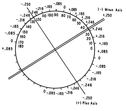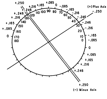 why the foregoing occurs and pass onto another topic. With regard to the cross cylinder and axis determination, comprehending the first paragraph is all you will need to be a successful refractionist. The full power of the cylindric lens lies 90° from its axis. For example, a + 1.00 D cyl × 180° has for its power at the 180° meridian 0 D and at the 90° meridian + 1.00 D. What may not be generally appreciated is that between these two meridians (180° and 90°) the lens has dioptric power. In the example just mentioned, this begins with 0 D at 180° and increases at each meridian to the maximum power, + 1.00 D at 90° (Fig. 1). Of course, this applies to any cylinder regardless of power, sign (plus or minus), or axis. A cylinder will have a power of 0 D at its axis and increasing plus or minus power at each meridian, reaching a maximum (i.e., the stated power of the cylinder) 90° from the axis.
