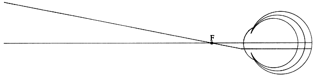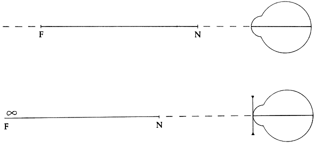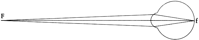| Myopia is defined as that optical condition of the nonaccommodating eye in which parallel rays of light entering the eye are brought to a focus anterior to the retina. It also can be described as the condition in which the far point of focus is located at some finite distance in front of the cornea. For practical purposes, this is a distance of less than 6 meters, the distance at which visual acuity is normally tested. Thus, the uncorrected, nonaccommodating myopic eye has some point at a finite distance beyond which objects are not seen clearly. At this far point, an object is in clear focus, but with increasing distances beyond it, the image becomes progressively more indistinct (Fig. 1). This far point also is defined as the focal point of the eye. The degree of myopia in diopters is found by determining the reciprocal of the far point or focal point of the eye measured in meters. Therefore, P = I/f where P is the power of the refractive error in diopters and f is the distance of the far point or focal point of the eye in meters from the eye. If thefar point of an eye is at 33.3 cm, then the eye is1/0.333 m = 3.0 D myopic. |
