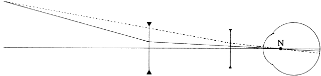 LENS TILTING To avoid coma, reflections, and image distortion and to accommodate the human facial anatomy, spectacles are best fitted so that the plane of the corrective lenses is perpendicular to the line of sight. Spectacles used for both distance and near are fitted with a downward “pantoscopic tilt” of approximately 7.5 degrees to the visual axis. This represents a compromise of sorts between the visual tasks that involve viewing straight ahead for distance and downward for near. The effect of tilting a minus spherical lens is the production of a minus cylinder at the axis of rotation (180 degrees). The cylindric power increases with both the degree of the tilt and the power of the lens. In addition, there is an increase in the myopic spherical refraction equal to approximately one third of the induced cylindric increase.8 An undercorrected myope is therefore able to obtain better distance acuity by tilting his or her glasses. As an example, the effect of tilt-ing a -10 D lens 10 degrees along the horizontalaxis results in an optical correction of -10.10 -0.31 × 180 degrees with a spherical equivalent of -10.25 D. If this same lens is tilted 30 degrees, the resultant effective optical correction is -10.95 - 3.65 × 180 degrees with a spherical equivalent of -12.78 D. It is not uncommon to see undercorrected myopes tilt their spectacles to attain better distance vision. CONVERGENCE AND ACCOMMODATION If an object of regard is brought toward a fully corrected myope with normal binocular fixation, the increase in divergence of the light rays from the object results in their being focused behind the retina. This stimulates ocular accommodation and convergence so that the image is brought into focus at both foveae. Both accommodation and convergence are altered with the use of minus spectacle lenses. Minus spectacle lenses have the effect of base-in prisms when the visual axes of the eyes are convergent. From Prentice's rule, the amount of prism in diopters is equal to the displacement, in centimeters, from the optical center of the lens times the dioptric power of the lens. P = d × p where P = prismatic power in prism diopters, d = displacement in centimeters from the optical center of the lens, and p = lens strength in diopters. In the case of a bilateral -15 D myope who is looking 3 mm nasal to the optical center of the lens, p = 0.3 × 15, or p = 4.5 prism diopters of inducedbase-in prism in each eye for a total of 9 prism diopters base-in for both eyes. Thus, the convergence required for binocular fixation at near is reduced with minus spectacles. This is a consideration when fitting a high myope with contact lenses who shows a mild degree of convergence insufficiency. Correcting this patient's vision with contact lenses might produce symptoms by increasing the convergence necessary to maintain near vision. The range of accommodation in the uncorrected myope is reduced in nonlinear proportion to the myopic error. This range is defined as the distance from the far point to the near point (i.e., point of focus using maximal accommodation) of the eye and represents the distance over which a clear focus can be achieved. The amplitude of accommodation, conversely, is defined as the difference in the refraction of the eye between these two values expressed in diopters. Figure 7 shows a 16 D range of accommodation in a -4 D myope with and without correction. It can be seen that with correction, the range of accommodation is greatly expanded. Without correction, a myope has the advantage of a closer near point. Thus, for special vocational or avocational needs that demand extended periods of work at a close near point, the removal of glasses often may be advantageous. Medium and high myopes learn of this advantage early in life and instinctively resort to uncorrected near vision for fine, detailed near work. Another maneuver used by many presbyopic myopes is that of sliding their spectacles down on their nose to increase vertex distance. This reduces the effective power of the minus lens and affords better near vision. Spectacle correction with minus lenses also requires less accommodative effort to maintain clear near vision.6 The greater the minus power and the greater the vertex distance of the lens from the eye, the less the accommodation necessary to see a near object clearly. For the hyperope, conversely, the greater the plus power lens and the greater its vertex distance, the greater the accommodative effort required to see an object at the same distance. With correcting spectacles at a vertex of 15 mm, a corrected + 10 D hyperope requires 3.9 D of accommodation to focus on an object 33 cm from his or her eyes, whereas this amount is only 3 D for the emmetrope. A corrected -10 D myope, however, requires only 2.1 D of accommodation to focus on the same object. Clinically, the increased accommodative effort required at near for a spectacle-corrected myope who first starts to use contact lenses frequently induces acute asthenopic symptoms. The possibility of near-vision problems should always be explained carefully to prospective myopic contact lens users, especially those who are approaching presbyopia. BIFOCAL SPECTACLES FOR MYOPIA The base-in prismatic effects of single-vision myopic spectacle lenses at near require modest adjustments in the patient's accommodative-convergence to accommodation ratio (AC/A). Image jump and object displacement due to the presence of two optical centers in bifocals, however, can present formidable adjustment difficulties. As the visual axes are shifted inferiorly and nasally to the optical center of the lenses when reading, both base-down and base-in prisms are induced. The best choice of bifocal lens segments is one that reduces the vertical prismatic displacement. One-piece bifocals, such as the Ultex design, achieve increased positive refraction of their lower segments by a reduction of minus power on the posterior surface of the lens. The optica
