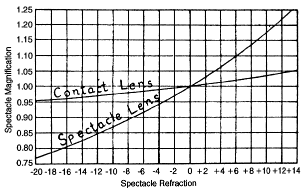 permit a more realistic expectation of their vision with, stronger spectacles. The minus spectacle lens operates at an optical disadvantage when compared with the plus lens, and this is increasingly so with higher degrees of refractive error. As can be seen in Table 1, a minus lens requires substantially greater power to correct a given refractive error than would a plus lens at the same vertex distance. Image minification also becomes more marked with greater lens powers of myopic correction and with increases in lens vertex distance.