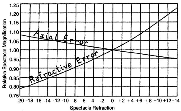 | Myopia can be characterized as refractive or axial, although a continuum of the two types exists. In refractive myopia, the overall refractive power of the eye as determined by cornea and crystalline lens power, modified by anterior chamber depth, is excessive in relation to an eye of normal axial length (21.5 to 25.5 mm). The axial length is normal because it is the product of normal growth. Axial myopia is the result of an excessive elongation of the eye with respect to its refractive components. In these eyes, there is added expansion due to stretching of the scleral wall. These differences in refraction components can have clinical effects. It is of some clinical importance to appreciate that equal amounts of myopic progression are produced by smaller increases in axial length in refractive myopia compared with axial myopia. For example, in refractive myopia, 0.34 mm of axial length change equals approximately 1 D of refractive error change, whereas in axial myopia, 0.4 mm of axial length change equals approximately 1 D of refractive error change.6 The differences between axial and refractive myopia also can affect retinal image size, which is discussed under Image Minification later in the chapter. |