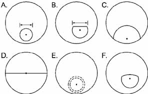 Available bifocal types are shown in Figure 1. The round segment (Figure 1A) has evolved from the Kryptok bifocal and classically has a diameter of 22 mm although other diameters are available. A chief advantage of round segments is that they are the least noticeable cosmetically, especially if a light tint (such as pink) is used. Disadvantages of the round segment are that image jump is fairly large because the distance from the top of the segment to the optical center of the segment is fairly large (i.e., half of the segment diameter). Also, because the top of the segment is curved, the top portion of the segment provides little width of near vision and is not very useful. This effectively enlarges the zone of unusable vision at the top of the segment. The 15 mm round segment is useful for patients engaged in activities such as golf or outdoor labor where a segment is considered bothersome yet the patient still requires some near vision. One successful solution for golfers is to use a monocular 15-mm round segment located superiorly or temporally on the same eye as the handedness of the golfer. Glasses with 15 mm round segments are usually for special usage and the patient will require a separate pair for other daily activities. FT bifocal segments (Fig. 1B), sometimes still referred to as “D”-type segments, lessen the problems of the round segment at the top of the segment. By eliminating the top of the circle, useful near-field width is attained immediately below the top of the segment line. Also, because the optical center of the segment for FT bifocals is 5 mm below the top line, the magnitude of the image jump is less than for round segments. FT bifocals have become the standard bifocal because of visual advantages, even though they are more noticeable cosmetically than round segments. FT28 is the most common width, however, other widths can be used dependent upon the visual needs of the patient. The Ultex-type bifocal (Fig. 1C) is characterized by very large amounts of image jump (the optical center is 19 to 20 mm below the segment top) and by limited distance zone in the lower portions of the lens. Because of these characteristics, the lens is not well-suited for general use. However, it is a very good lens for hyperopic patients who perform considerable near work such as at a desk. This is because the hyperopic patient obtains base-up prism with depressed gaze, hence re-quiring excessive depressed gaze to view typical near materials. Base-down prism from the Ultex bifocal counteracts the prism from the plus distance lens and reduces the amount of required gaze depression for near materials. The Ultex bifocal should be considered for this specialty use, but the large amount of image jump at the segment top and the minimal distance zone in the lower lens are detriments to prescribing the lens for general use. The Executive bifocal (Fig. 1D), sometimes still referred to as a Franklin bifocal, has the advantages of an extremely wide near-viewing zone and no image jump at the top of the segment because the optical center of the add is on the segment line. Despite these advantages, the lens is limited in scope because of the lack of any distance zone in the lower portions of the lens. This is very bothersome for ambulation and general daily wear. The lens is best suited to meet extensive near-viewing needs such as at a desk. However, many practitioners prefer to use a FT35 or FT45 instead for these purposes. The blended bifocal (Fig. 1E) is a variant of the round bifocal. The boundary between the distance and near zones is blended to produce an apparent seamless lens. Cosmetic appearance is the sole reason to use this lens because the blend area (2 to 3 mm wide) increases the area of unusable vision and decreases the diameter of the usable near vision zone. The curve top bifocal (Fig. 1F) is intermediary to the round and FT bifocals and also possesses intermediary properties. Although it can be a successful general usage lens, it has not enjoyed broad usage probably because of the larger visual advantages of FT bifocals. PATIENT ADAPTATION First-time bifocal wearers will go through an adaptation period. Some of the most common problems involve the altered location of objects through the bifocal segment, creating problems with stairs, curbs, and similar situations. First-time wearers should be counseled about these initial problems. |