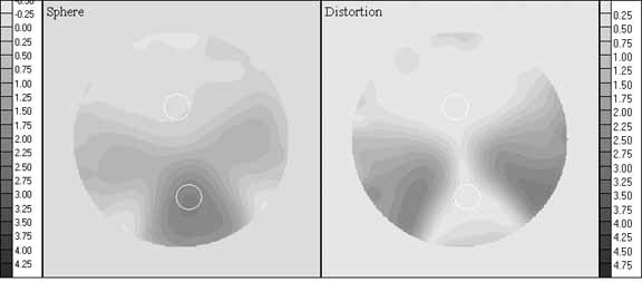 GENERAL Since their introduction to the U.S. market in the 1960s,3 PALs have steadily increased their share of the multifocal market. Several studies have shown a large percentage of patients prefer PALs compared to bifocal lenses.4–6 PALs provide a continuous change of power from distance through intermediate to near that provides the wearer with a seamless visual space and eliminates the unusable area of visual space caused by the top line of a bifocal segment. A detracting feature of PALs is that the design necessarily results in unwanted astigmatism in the periphery of the lens, usually located in the lower diagonals relative to lens center. PALs have both cosmetic and vision advantages compared to segmented multifocals. The cosmetic benefit results from the seamless design and is apparent. The vision advantage results from elimination of the bisecting region of unusable vision associated with the top of the bifocal segment, resulting in contiguous visual space from distance through intermediate to near. The vision advantage with PALs compared to bifocals is supported by a study that showed patient preference for PALs compared to a blended bifocal,7 both of which are seamless. The strong preference for PALs compared to bifocals is further supported by another study8 in which 265 habitual bifocal wearers were fitted with PALs: 92% of these patients preferred the PALs. Because progressive lenses have no image jump and no areas of intermediate blur, many wearers describe their vision with progressive lenses as more natural than with bifocals. OPTICAL CHARACTERISTICS Progressive addition lenses are designed to provide distance viewing in straight-ahead gaze, a gradual progression of power in an intermediate corridor, and the full addition power lower in the lens. The power change is accomplished by increasing the curvature of the front surface (i.e., decreasing the radius of curvature) along the corridor toward the bottom of the lens. Because the add must be spherical in nature, the curvature must increase equally in all meridians (i.e., it must increase in the horizontal as well as the vertical meridian). As result, the horizontal curvature is flatter in the upper portion of the lens and steeper in the lower portion of the lens. To reconcile the curvature disparity and to make a seamless lens, surface curvature must be altered in the lower quadrants of the lens. This results in the unwanted astigmatism. Therefore, a necessary and undesirable side effect of the gradual progression of power is unwanted astigmatism in the periphery of the lens. The pattern of unwanted astigmatism is a defining characteristic of individual PAL designs. The unwanted astigmatism limits the error-free viewing zones of the PAL, resulting in considerably narrower error-free distance, intermediate, and near-fixation fields than typical bifocal lenses. The magnitude and location of unwanted astigmatism are worse with higher adds (greater change in curvature required) and when the distance and near centers are closer to one another (curvature must change over a shorter distance). Primarily as a result of the latter, the near zone of a PAL is lower in the lens than for a FT bifocal. Whereas a very wide near zone is attained with a FT bifocal with approximately 16 to 20 degrees of ocular depression, most PALs require gaze depression of 30 to 35 degrees to obtain the near zone, one that is also considerably narrower than provided by a FT bifocal. A common method to represent the optics of PALs is with contour plots of the spherical equivalent and unwanted astigmatism powers as shown in Figures 4 and 5. Because of the complex nature of the optics there are literally an infinite number of possible PAL designs and dozens of different designs are currently available. Although most current PALs defy clear categorization, it is instructive to consider the differences between a “hard” and “soft” design. The lens in Figure 4 shows characteristics of a hard design. Relatively speaking, a lens of hard design has wider error-free distance and near-viewing zones, the area of the lens with unwanted astigmatism is relatively small, and the magnitude of the unwanted astigmatism is large. The separation between the distance and near centers is shorter and the rate of power change along the corridor is greater. The lens in Figure 5 shows soft design characteristics: narrower error-free distance and near-viewing areas, larger area of unwanted astigmatism but of lower magnitude, distance and near centers are farther apart, and a lower rate of power change in the corridor.