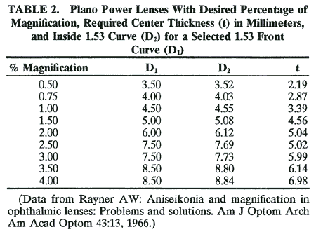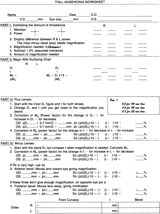 (This is a minification, since it represents a decrease in vertex distance.) The magnification from Ms with this change in D1 is then 3.6% - 0.6% = 3.0%. The right lens is 4.2% and the left lens is now 3%, and the difference is 1.2%, which is very close to the 1% needed. There is no need to change t, center thickness. This is a practical endpoint. Discussion To decide which curve to use on the left lens for the front surface, I first consulted the surfacing chart to see what curves are available that are less than the 11.00-D curve on the right lens. I found these three possible curves: 10.25, 9.50, and 8.75 D. The 10.25 D gives shape magnification of 10.25 × 5.7/15 = 3.9%, which did not seem to be enoughof a change, whereas the 8.75-D curve was 8.75 × 5.7/15 = 3.3%. At first this seemed to be the curve of choice, but when the power factor was calculated, the difference, (11.00 - 8.75) = 2.25 D, gave a1.6-mm vertex distance change (2.25 × 0.7), and this vertex distance change gives minification of 1.0%: (1.6)(+ 6.00)/10 = -1%. This 1% loss of magnification when added to the 3.3% would have resulted in 2.3% for the left lens, and this when subtracted from 4.2% of the right lens would become 1.9% magnification on the right eye, which is 0.9% too much magnification. Recalculating, using the 9.5-D figure gave the correct answer. Other possibilities include the following: