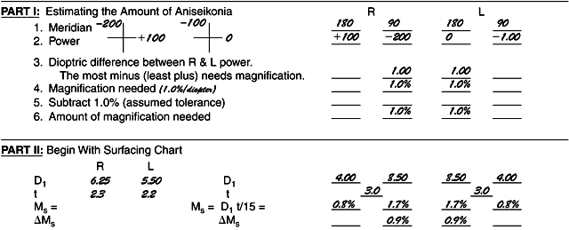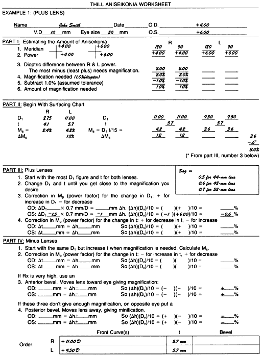 Add this correction to the Ms found in Part II. If the magnification is still not the desired amount, go to the other lens to increase the front curve and increase the center thickness, correcting both changes for Mp changes as was done in the above (Fig. 2). Part IV For explanation, see later discussion Example 2, Minus-Lens Problem. EXAMPLE 1: A PLUS LENS PROBLEM The right eye requires a + 4.00-D lens and the left eye a + 6.00-D lens. Vertex distance, h, is 10 mm, and the lens will be 50 mm wide (see Fig. 2). Part I The + 4.00 D is put on the optical cross for both horizontal and vertical meridians for the right eye, and the + 6.00 D is put on the optical cross for both horizontal and vertical meridians for the left eye. Line 1: Since lenses are spheres, all the meridians are the same. Part II The surfacing chart gives 8.75 D for D1 and a4.1-mm center thickness for the right lens and11.00 D for D1 and a 5.7-mm center thickness for the left lens. Calculating the Ms from shape gives us the amount of magnification we would receive from the lenses if the lenses were ordered as “stock” lenses: Ms = 8.75 × 4.1/15 = 2.4% for the right eye Ms = 11.00 × 5.7/15 = 4.2% for the left eye These lenses would give us a net 1.8% magnification on the left eye, not at all what was required, which was 1% magnification on the right eye. Using the larger D1 and center thickness figure, place these amounts in the lines to the right of Part II. (Using the identical curves and center thicknesses on each lens would give zero magnification difference from Ms factor, which, while it is better than the stock lenses, is still not the 1% magnification required for the right eye.) Decrease the front curve on the left lens to9.5 D. Recalculate Ms: Ms = 9.5 × 5.7/15 = 3.6% Part III Correct the Mp. For this change of D1, enter on line 3 the 1.5-D difference: