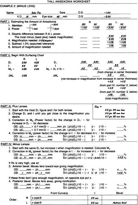 EXAMPLE 2: MINUS LENS PROBLEM The right eye requires a -1.00-D lens and the left eye a -3.00-D lens. Vertex distance, h, is 15 mm, and the lens will be 48 mm wide (Fig. 3). Part I Using the same directions given in the plus lens problem of Figure 2, fill out Part I of the Thill Aniseikonia Worksheet down to line 6, the amount of magnification needed, which in this example is 1% on the left eye. Part II The surfacing chart indicates that at a 5.50-D curve would be used on the right lens and a 4.25-D curve on the left lens, with both center thicknesses being 2.2 mm. Calculating the Ms from shape gives us the amount of magnification we would receive from the lenses if the stock lenses were ordered. Ms = 5.5 × 2.2/15 = 0.8% for the right eye Ms = 4.25 × 2.2/15 = 0.6% for the left eye Part IV Dropping down to the instructions for minus lenses, line 1 states to begin with the same D1 for the front curves of both lenses and increase center thickness where magnification is needed. Begin by first making both lenses the same: