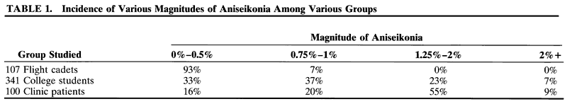 population need and benefit from the correction of an aniseikonia. Gillott, in England, examined a cross section of a community and found 8% to have a significant aniseikonia, associated with symptoms.3 Ewalt, who used eikonometry for a lengthy period, suggested the clinically significant incidence to be about 2%.4 Duke-Elder said that some degree should be expected in 20% to 30% of people who wear spectacle correction.5 A study of different groups shows differences in occurrence. Burian and Triller showed that the composition of the group influences the incidence (Table 1)6.