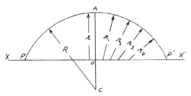 the selected meridian curve is the optical axis of the surface. Consider the geometry of a toric surface. If a circular arc is rotated about an axis in the plane of the arc, which axis is not a diameter of the circular arc, a toric surface will be generated. If the axis lies between the circular arc and its center of curvature, the surface generated is termed a spindle torus and here the meridian curve has a greater radius of curvature than the equatorial curve (Fig 13). In the spindle torus, the normals from the meridian curve, which are directed toward its center of curvature, intersect the axis of revolution at progressively shorter distances, with increasing distances of the normals from the equatorial curve. Each normal from the meridian curve to the axis of revolution represents a sagittal or transmeridian radius of curvature, and, as shown in Figure 13, the transmeridian radius of curvature progressively decreases while the radius of curvature of the meridian curve is constant. When the difference in the two principal curvatures at the equator is small, the difference in meridian and transmeridian curvatures remains practically constant for a relatively large distance from the equator. When the difference in the two principal curvatures at the equator is large, the difference in meridian and transmeridian curvatures becomes significantly different from that at the equator within a relatively short distance from the equator. If the center of curvature of the meridian curve lies between the axis of revolution and the meridian curve, the surface generated is a barrel torus and here the transmeridian curvature decreases with distance from the equator (Fig 14). Just as described above for the spindle torus, the rate at which the difference between the meridian and transmeridian curvatures becomes significant with distance from the equator in the barrel torus is proportional to the difference in the two principal curvatures at the equator. Toric spectacle lenses can completely neutralize the effect of ocular astigmatism if it is of a regular type in which there are two distinct principal refractive powers of the eye for central vision. As shown above, toric surfaces are not of constant curvature but vary along a meridian. It is important that the design of toric lenses take into account the geometry of toric surfaces if aberrations of central vision through the periphery of the lenses are to be minimized by bending of the lenses. |