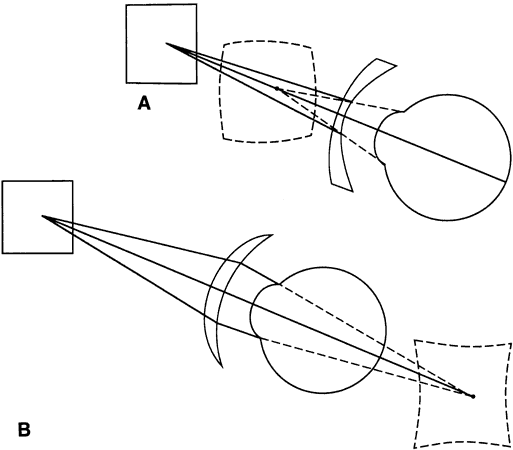 A standard terminology describes the foci created by radial astigmatism. Suppose a patient were to look laterally away from the center of a lens at a cross target. If the patient's field of view is considered to be a circle on a vertical plane, with the cross pattern at the lateral edge of this circle, then the vertical arms of the cross are tangent to this circle. The focus of the vertical arms by the lens is termed the tangential focus, and errors in their focus position relative to the far point sphere are tangential errors. Errors in focus that affect the cross arms perpendicular to the tangential detail (i.e., the horizontal cross-arms) are termed sagittal errors, and the focus of these lines is called the sagittal focus. If the patient were to look upward at a cross at the top of the field of view, the horizontal cross-arms would be tangential to the field-of-view circle, the focus of the horizontal cross-arms would be the tangential focus, and the vertical cross-arms would be imaged to form the sagittal focus. Tangential and sagittal focus errors increase as the distance from the center of a lens increases. The two foci formed by a lens with radial astigmatism may be in front of the far-point sphere or behind the far-point sphere, or they may straddle the far-point sphere. The average dioptric value of the two focus positions specified relative to the zero value of the far-point sphere is termed power error. Power error increases as the distance from the optic axis of a lens increases, and the image surface for an extended object is curved, resulting in curvature of field (Fig. 5). Generally, power error and radial astigmatism cannot be eliminated at the same time.13 When radial astigmatism is eliminated, there will be some residual power error, and when power error is eliminated, some radial astigmatism will still be present (Fig. 6). Rather than attempt to correct power error directly, lens designers may try to minimize individual sagittal or tangential focus errors. A sagittal or tangential focus position behind the far-point sphere (negative error) probably has less effect on visual acuity than a focus position in front of the far-point sphere (positive error) because a patient can accommodate and pull the negative focus forward onto the retina. Therefore, perfect balancing of the sagittal and tangential errors, one in front of and one behind the far-point sphere, may not provide optimal off-axis image quality. Correction of a positive error with larger tolerances for negative errors may be the best strategy. Which aberration, radial astigmatism or power error, is more important to correct? This question has been the source of considerable discussion and argument in the optical industry for years,14 and the discussion continues. Most current lens designs compromise, attempting to minimize both aberrations without completely correcting either. This topic is discussed more fully in the section on the evolution of lens design. Transverse chromatic aberration, or lateral color, is caused by dispersion, the variation of refractive index with wavelength that occurs for all spectacle lens materials (Fig. 7A). When a patient looks laterally to view a point object through a lens, the different wavelengths of light from the object each are refracted differently, “smearing” the image into its component colors (see Fig. 7B). If the object is not a point, but instead a large object such as a cross, the effects of dispersion are not the same. Each wavelength of light from the vertical arms of the cross is refracted differently, resulting in color fringes that surround the image of the vertical arms. However, the image of the horizontal cross-arms is relatively unaffected because the dispersion of the light into its component colors occurs along the arms of the cross and is not noticeable except at the cross-ends. Therefore, it can be argued that the effects of transverse chromatic aberration may be more important for the tangential focus than for the sagittal focus. The effect of transverse chromatic aberration is analogous to the dispersive effects visible when looking through a prism. The prismatic effects of a lens vary with the lens power and with the distance from the lens optical center that a light ray passes through the lens. The relationship is termed Prentice's rule15: P = h × D (1) where P is the prism obtained in prism diopters, h is the distance from the lens optical center measured in centimeters, and D is the lens power in diopters. Prismatic effects are larger for higher-power lenses and larger angles of view, so transverse chromatic aberration, which is related to the prismatic effects of a lens, will be worse for these same conditions. High-index glass and high-index plastic lens materials have more dispersion than crown glass or CR-39 plastic, and the problems of transverse chromatic aberration are more important for lenses made of these materials. Clinically, patients report color fringes around objects only when looking away from the center of these high-power, high-index lenses, but it is unusual for patients to report color fringes when their lens powers are less than approximately 5.00 D. The lens designer cannot vary the dispersion of a given material, so in a sense, nothing can be done about transverse chromatic aberration. However, proper lens design to minimize or eliminate other aberrations and proper fitting techniques in the optical dispensary can minimize the total off-axis blur and improve visual acuity. Distortion is a lens aberration caused by the variation in magnification from the center to the edge of a lens (Fig. 8). It has little effect on resolution of an image, but it does affect the shape of the image. When an extended object is imaged by a high-minus power lens that has decreasing magnification toward the lens periphery, the images of portions of the object farther from the lens center are magnified less than those closer to the center, resul