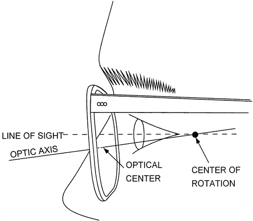 A SIMPLE DEMONSTRATION If one takes a large handheld magnifying glass and looks at a magazine with some vertical and horizontal lines or at a piece of graph paper, the effects of lens aberrations can be observed. With the glass held squarely with the paper and perpendicular to the line of sight, the field of view has good optical quality to the edge of the lens. If the lens is tipped away at the top and the lines are viewed through the top of the lens, horizontal lines become blurred, colored and curved, whereas vertical lines are in better focus, straight, and uncolored. If the lens is tipped sideways, similar effects occur. The blur is tangential error, the color is transverse chromatic aberration, and the curve is distortion. The difference in blur between the horizontal and vertical lines is off-axis or radial astigmatism. THE NEED FOR COMPROMISE At its simplest level, the design process for a spectacle lens involves the calculation of the sagittal and tangential errors of each principal meridian for different sets of front and back lens curves. This calculation is done to determine which combination provides the best off-axis optical quality. As the surface curves are altered, different combinations of aberrations occur. Some errors will always be present. Even with the use of aspheric surfaces, the same problem exists. Thus, the lens design process is one of compromise, in which an optimal choice is made from the available options. What constitutes the optimal choice has been the topic of controversy both in the professional literature and in advertising for more than 60 years. One reason that controversy still exists is that patients seldom have a chance to compare two different designs. Another reason is that instrumentation for measuring off-axis aberrations is uncommon. Finally, factual information regarding the various lens designs is scant. Much more information could be supplied by manufacturers, but “complete” information would be difficult to handle. Several hundred tables of data would be needed to describe the performance of the different types and designs of currently available lenses. However, we attempt to explain the differences between lens products, and their significance. THE GEOMETRIC BASIS OF LENS DESIGN Figure 9 shows the idealized geometric relationship of a spectacle lens to the eye. In the figure, the optic axis of the lens is shown as an imaginary line that connects the centers of curvature of both lens surfaces and passes through the lens optical center. When designing a lens, it is assumed that the optic axis passes through the eye's center of rotation. In spectacle lens design, the center of rotation is termed the optical stop of the system because its position determines which rays reach the fovea in off-axis gaze. The stop distance, or center of rotation distance, is the distance from the back surface of the lens to the center of rotation. Traditionally, this value has been assumed to be a constant, often 27 mm,14 but there is significant variation in this distance in the population. Lens designers calculated the optimal base curve for a lens based on this value. The center of rotation distance is the sum of the vertex distance and the sighting center distance, the distance from the corneal apex to the center of rotation. Let us assume that the lens is fitted at the same vertex distance as was used in the refractive examination or that the prescription has been compensated for any difference between the two. The image of a distant object then falls at the far point. As the eye rotates to look off axis, the far point also rotates, tracing out the far-point sphere. Note that the ray bundles pass through the center of rotation of the eye. By convention, the dioptric position of the focus of light from an off-axis object is calculated relative to the reference sphere, the sphere tangent to the back surface of the lens at the optical center and centered on the center of rotation of the eye. Errors in image formation are then expressed as dioptric differences from the desired focus position on the far-point sphere. Until recently, throughout the history of spectacle lens design, the basic input that linked the patient to the lens was the center of rotation distance. This optical stop of the lens-eye system is where all the lines of sight to the various points in the field of view cross. Typical Fitting Geometry Figure 10 illustrates the positioning of a frame and lens on the face. Most lenses are worn tipped slightly toward the eye through an angle of approximately 10 degrees. This is the pantoscopic angle. Also, most frames, especially plastic frames, fit the nose such that the center of the lens is a few millimeters below the pupil when the patient is looking straight ahead. Fortunately, the combination of downward tip and lowered fitting position tends to keep the center of rotation of the eye close to the optic axis of the lens (within 3 mm), and the lens vertex is automatically approximately on the reference sphere. In short, Figure 10 is Figure 9 tipped downward, with some flexibility added. The fit of a frame can be evaluated by drawing an imaginary line perpendicular to the eyewire at its vertical center and projecting backward into the eyeball, as shown by the line in Figure 10. The edge of a ruler placed against the frame and cheek area aids in visualization of the line. This line indicates the location of the optic axis of the lens. It should seem to pass approximately through the center of rotation. This point is behind the canthus, as shown in the figure. Because the greatest use of lenses is for straight-ahead and downward viewing, the normal cosmetically attractive pantoscopic angle is also functionally desirable. For most prescriptions, departures from the ideal alignment shown in Figure 10 do not create serious errors. However, in fitting aphakic lenses and strong hyperopic or myopic corrections, the dispenser must take care to obtain a 