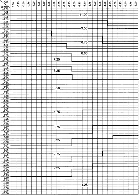 Magnification differences between the eyes usually are small, less than 5%. (The magnifications of commonly used low-vision aids are in the neighborhood of 2× to 10× , or 200% to 1000%). However, when a small image size difference is created between the eyes, the brain interprets the difference as a clue for binocular stereoscopic depth perception. Because stereoscopic vision is so sensitive, small differences in magnification can create significant problems with spatial perception. These difficulties often are manifested as problems in adapting to new glasses. The accepted threshold at which problems can occur is a difference of 0.8% to 1% between the eyes.13 Differences in magnification caused by differences in the astigmatic corrections for each eye, whether cylinder power differences or cylinder axis differences, may result in both image size differences and changes in the shapes of the two images. Oblique cylinders (cylinder axes close to 45 or 135 degrees) tend to cause the most problems, with patients reporting problems for cylinder powers of 0.75 D or less. The spectacle magnification formula of equation 2 does not provide a method for calculating magnification differences between the eyes in anisometropia. The difficulty occurs because the spectacle magnification formula relates the retinal image size when a correcting lens is worn to the uncorrected image size. Unless the uncorrected retinal image sizes for the two eyes are the same, spectacle magnification calculations cannot provide any information about the relative image sizes of the eyes. For example, if the spectacle magnification for the right eye is calculated to be 5% and the spectacle magnification for the left eye is 2%, it cannot be said that the right eye image is 3% larger than the left because the uncorrected right and left eye image sizes may not have been equal before the spectacles were worn. Calculation of retinal image size differences between the eyes requires knowledge of such parameters as the axial length and the power of each eye,26 information that is not easily available. For exact measurement of magnification differences between the eyes, an eikonometer must be used. One should not assume that a patient's displeasure with a new pair of glasses is a result of magnification problems. The obvious questions to be asked are, “What were the powers of the patient's old glasses?” and “Has the patient had problems adapting to other pairs of glasses in the past?” The old adage of not changing the base curves of a new pair of glasses relative to the values of the patient's old glasses makes little sense because the new power magnification differences usually are much greater than any likely change in shape magnification difference. Before attempting to solve a suspected magnification problem, the glasses should be checked thoroughly against the lens powers ordered in all respects and the base curves verified against the manufacturer's chart. Aniseikonia When an anisometrope cannot adapt to the difference in the magnification effects of the two lenses, then the patient has clinically significant aniseikonia. Because eikonometers are not commonly available for clinical use, the diagnosis and management of aniseikonia is usually based on clinical signs and symptoms, with magnification differences estimated from the differences in refractive error.27–30 Correction of aniseikonia requires an alteration of base curves and center thicknesses (alteration of the shape factors) from their normal values to alter the magnifications of the retinal images. Spectacle lenses designed for this purpose are termed eikonic or iseikonic lenses. These lenses are often expensive and difficult for the optical laboratory to manufacture. Rather than provide eikonic lenses, practitioners often alleviate spectacle adaptation problems, or aniseikonia, by modifying the prescription. When cylinder corrections are at oblique axes, patients often report distortion of images (tilting of walls or floors, floors being too close or too far away). Often the problem can be minimized or eliminated by a decrease in the cylinder power or a rotation of the cylinder axes toward 180 or 90 degrees. This prescription modification can be thought of as a modification of the lens magnification, although the resulting image blur decreases sensitivity to image magnification. A partial correction of a large spherical anisometropia, such as that created by a beginning nuclear cataract in one eye, is another commonly used solution for spectacle-induced aniseikonia. These types of prescription modification require sound clinical judgment because visual acuity is being sacrificed, but they provide an acceptable solution if correction of aniseikonia will not be attempted. THE BASE CURVE CHART, A “BLUEPRINT” OF THE DESIGN A base curve chart presents the base curves that are used for a given lens power for a particular lens design. If the back surface curves and center thicknesses are also included, then the chart is more properly termed a surfacing chart because it provides all the information needed to make a finished lens. Figure 13 shows a hypothetical base curve chart for a lens series. It is hypothetical in the sense that the base curves and boundaries between them were not evaluated by computing and do not represent any existing lens series. This type of chart is used as a guide for laboratories in selecting semifinished blanks for use in grinding a given prescription. A similar set of charts could be used in the optical dispensary if base curve selection depends on frame fitting distance. In the ophthalmic industry, the base curve chart is a statement of the lens design. Because it delineates the structure of each lens in a series, the base curve chart is, in a sense, a blueprint and a guide to indicate the base curves that the designer intended for various prescriptions. The dispenser knows which base curves to expect when he or she orders a pre