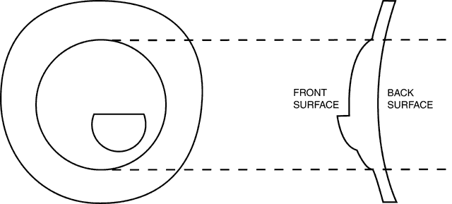 Full-field aphakic lenses have an aspheric front surface but appear similar to a conventional nonlenticular lens. Some of these lenses rapidly flatten toward the periphery, with the curvature actually becoming negative, giving the lens the appearance of a “blended lenticular.”20 Full-field lenses tend to be thicker than lenticular designs, but they are better cosmetically and are more commonly used. Aphakic lenses may have either a round or a D-shaped bifocal segment. The round segment sometimes is preferred because the base-down prismatic effect in the top of the segment neutralizes some of the base-up prism from the distance portion of the lens, providing better optics through the bifocal than for a D segment. Also, in the laboratory layout process, a round segment lens blank can be rotated about the pole of the aspheric surface to obtain the segment decentration necessary to match the patient's near interpupillary distance (PD.) Both segment types provide adequate near vision. |