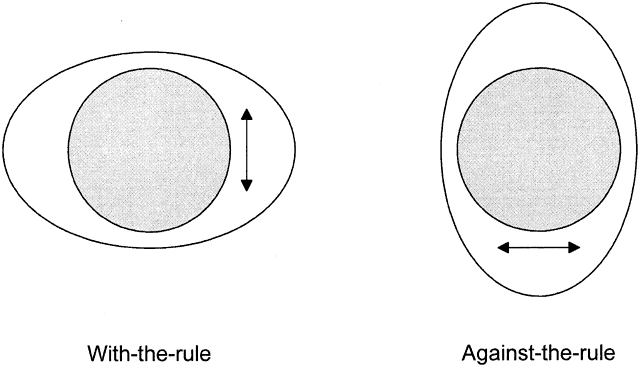 ASTIGMATISM Keratometry can show whether corneal astigmatism is with the rule or against the rule. With-the-rule astigmatism means that the corneal “egg” is lying on its side; against-the-rule astigmatism means that the egg is standing on end (Fig. 5). Here are keratometric examples: