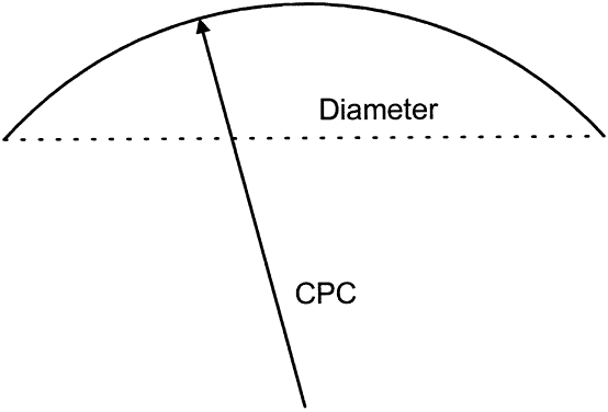 Therefore, the final CPC is 43.00 D. These examples illustrate that as corneal astigmatism grows larger, the CPC of a rigid lens grows steeper, providing stability on an increasingly astigmatic cornea. Thus far, we have considered CPCs for lenses where the diameter is less than 9 mm. If the diameter is larger than 9 mm, make the CPC either 0.25 D steeper than K or one fourth of the corneal astigmatism steeper than K, whichever is steeper. Remember that a large lens is a tight lens, so the CPC is made relatively flatter than before to compensate for the large diameter. The final lens possesses a CPC of at least 0.25 D steeper than K. Using the first example, where the keratometry is 42.00/42.50 @ 90°, K remains 42.00 D, but one fourth of the corneal astigmatism is (42.50 - 42.00 D)/4 = 0.12 D. To compute,