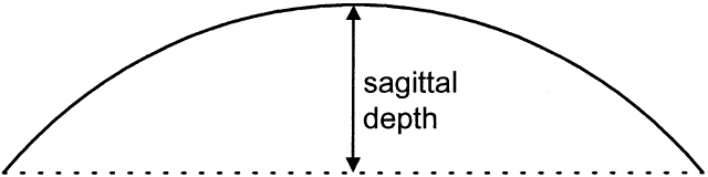 Because these lenses are fitted strictly from a diagnostic set and calibrated by sagittal depth (Fig. 20), the CPC and diameter of the dispensed lens are taken from the properly fitting diagnostic lens itself. Therefore, the only calculation necessary is the power of the lens. This calculation is performed similarly to the method for standard rigid lens fitting. Note, however, how the CPC is expressed for this type of lens: central curve/peripheral curve, for example, 54.00/45.00 D. Example A keratoconus patient desires contact lens fitting. A diagnostic lens of CPC 52.00/45.00 D and power of -16.50 D was tried on the patient, and the overrefraction was found to be -3.00 D. A lens of CPC 56.00/45.00 D next was tried, and this lens fit better, as the first lens bore on the cone. Thus, the following calculation was performed: