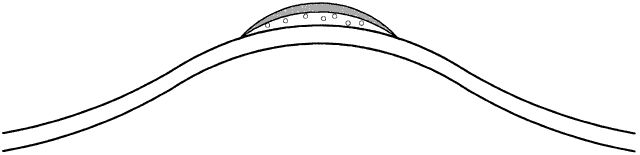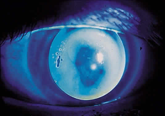 KERATOCONUS Keratoconus is a corneal disease in which a metabolic defect leads to a corneal cone.26,27 This disease produces irregular astigmatism, myopia (from anterior corneal displacement), and central scarring; the first two can be treated with a contact lens. Because of the irregular astigmatism, the keratometer is useless, except as a possible indicator of relative severity. I believe that the best way to rehabilitate the keratoconus patient is to fit Soper-type keratoconus lenses.21,28 This type of lens is a bicurved lens; thus, a steep central posterior curve (CPC) vaults the cone, and a relatively large peripheral curve fits the peripheral cornea outside the cone (Fig. 16). This lens is fitted based on the concept of sagittal depth, and calibrated diagnostic lenses are placed onto the eye until a proper fluorescein pattern is observed. If a diagnostic lens produces an air bubble or extreme fluorescein pooling, then that lens has too large a sagittal depth (too steep), and a lens with a smaller sagittal depth should be tried. A flat lens produces apical touch, requiring that a steeper lens be tried next. The correct lens barely vaults the cone, demonstrating a uniform central fluorescein pattern, as demonstrated in Figures 17 through 19.