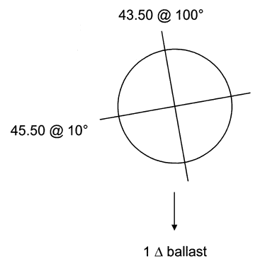 There is more refractive astigmatism than keratometric astigmatism, indicating residual astigmatism. There is not that much corneal astigmatism (2 D); thus, a simple bitoric lens will not hold in place very well. A diagnostic lens of CPC 42.00 D (only a few PMMA diagnostic lenses were available at the time, so this one had to be used), diameter 9 mm, power + 0.50 D was placed onto the eye, and the following overrefraction was obtained: -0.25 + 1.00 × 5°. Slightly more residual astigmatism was present than was anticipated. To begin calculations, the overrefraction first must be converted to minus cylinder, then to a power cross, in the same manner as for a standard bitoric lens: