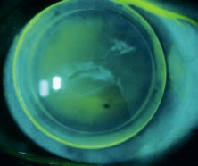 wound gaps with flat anterior chambers. EPITHELIAL EROSIONS Thin, highly oxygen permeable, (hydrophilic) soft lenses have been used very successfully in the treatment of epithelial corneal erosions. The purpose of the lens is not only to manage pain but also to assist in the healing process of the corneal surface. The lens assists surface healing by protecting the loose epithelium from the mechanical trauma of the eyelid, as well as by preventing adherence of the epithelium to the underlying cornea. The authors recommend using a highly oxygen permeable, lower water content lens. A tight-fitting lens should be avoided to prevent corneal edema or other complications. Easy tear flow under the lens is very important, and the frequent use of artificial tears is highly recommended. A dry lens will actually make the condition worse. BULLOUS KERATOPATHY Pain management is the most valuable use of a bandage lens in patients with bullous keratopathy, although improving visual acuity is often possible and successfully accomplished as well. Although a tight-fitting lens will likely cause further problems and complications, a very loose-fitting lens should also be avoided because it can actually worsen the symptoms resulting from the constant mechanical trauma of the lens over the corneal surface. Copious use of lubricants or artificial tears is strongly recommended. FILAMENTARY KERATITIS Patients with filamentary keratitis also greatly benefit from the use of a bandage soft lens. Regardless of the clinical reason for the filaments, placement of a bandage soft lens will typically help within a relatively short period. In most patients the filaments disappear within a week. Removal of the lens is advocated after the filaments disappear. The frequent use of lubricants is also very important in these patients, both during lens wear and after removal of the lens. A thin, low water content lens is also recommended in these patients. TRICHIASIS Although removal of the misdirected eyelashes is the preferred treatment of trichiasis, a soft bandage lens offers valuable temporary relief for this condition, particularly when the misdirected lashes cause direct trauma to the cornea. Bandage lenses offer protection to the cornea but not the conjunctiva. It is equally important to protect the conjunctiva from the damaging effects of chronic, repeated trauma by the abnormal eyelids and eyelashes. Although patients without corneal involvement are not typically as symptomatic, care should be taken to avoid long-term deformities. ALKALI BURNS Bandage lenses have proven to be very helpful in promoting re-epithelialization of the cornea in patients with chemical burns. Although the contact lens will not prevent many of the complications of an alkali burn such as symblepharon and conjunctival overgrowth, they will assist in corneal epithelial healing and pain management. As in most situations in which a bandage lens is used, a thin, highly oxygen permeable lens is recommended and lubrication is very important. PENETRATING CORNEAL WOUNDS Bandage soft lenses have been used very successfully in the treatment of patients with small penetrating corneal wounds that have clean edges (without irregularities) and good apposition, without iris prolapse or incarceration. In most instances these are trauma patients (Fig. 2), although the perforations may be seen in some postsurgical patients such as after refractive surgery, radial keratotomy (RK).