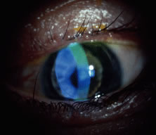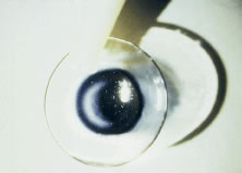 The lens provides tamponading of the wound and thus assists in the restoration of the anterior chamber and promotes wound healing. Bandage lenses have also been used after corneal transplantation in patients who have a small wound gape, particularly when resuturing is not possible or is complicated. GLAUCOMA SURGICAL PROCEDURES Through the years, bandage lenses have been very helpful in some glaucoma procedures. Flat anterior chambers secondary to a wound leak from a small perforation on the bleb can be resolved with the use of a large-diameter, thin, low water content soft lens. In these cases, the lens will provide a tamponading effect that will facilitate wound closure and healing, thus allowing the reformation of the anterior chamber and providing protection from infection and other complications. In some instances, tissue adhesive has been used very successfully with the bandage lens. A bandage lens is helpful when the Simmons compression shell is used. In these cases the lens is placed between the shell and the cornea to offer protection from the mechanical trauma of the shell against the cornea. |