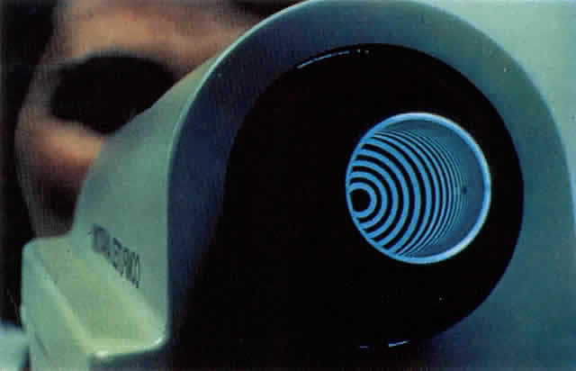 of corneal shape. The first known keratoscope target was the image of a window, as reported by Scheiner in 1619 using natural light. He estimated the corneal curvature by comparing the window pane corneal reflection to those of a series of marbles until he found one that gave an image the same size as that of the cornea.1 In 1820 Cuignet developed a keratoscope through which he observed the reflected image of an illuminated target held in front of a patient's cornea. His major problem was in the alignment of the light, target, and observer with the patient's visual axis. This was overcome in 1882 by Placido, who placed an observation hole in the center of the target.2 Placido's target of alternating black and white rings (the Placido disk) has been embodied in many devices that are currently used to measure corneal topography, hence the term Placido disk keratoscopy. A modern version of the original Placido disk is the Klein hand-held keratoscope (Fig. 1). This device is useful for detecting the location of tight sutures, irregular astigmatism, and keratoconus, all of which can be detected by mire pattern recognition. Its main limitations are that its mire pattern has an outer diameter of 5.5 mm, limiting its utility for evaluating peripheral topography. In addition there is no mechanism to achieve alignment other than user estimation, which introduces significant error in subjective interpretation.1 Photokeratoscopes (e.g., Corneascope: Keravision, Santa Clara, CA) project a series of concentric circular mires that form a virtual image located within the anterior chamber of the eye. Information regarding the power of the anterior corneal surfaces is derived from visual inspection of the size and shape of the mires.